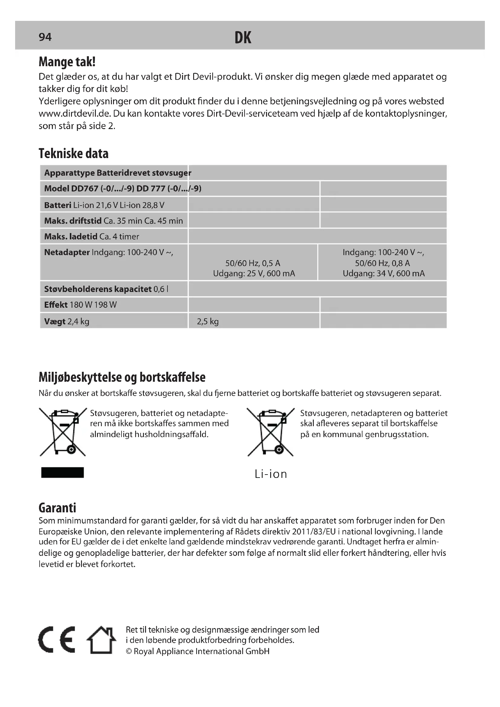 93Ret til tekniske og designmæssige ændringer som led i den løbende produktforbedring forbeholdes.© Royal Appliance International GmbH Mange tak! Det glæder os, at du har valgt et Dirt Devil-produkt. Vi ønsker dig megen glæde med apparatet og takker dig for dit køb! Yderligere oplysninger om dit produkt nder du i denne betjeningsvejledning og på vores websted www.dirtdevil.de. Du kan kontakte vores Dirt-Devil-serviceteam ved hjælp af de kontaktoplysninger, som står på side 2. Tekniske data Apparattype Batteridrevet støvsugerModel DD767 (-0/.../-9) DD 777 (-0/.../-9)Batteri Li-ion 21,6 V Li-ion 28,8 VMaks. driftstid Ca. 35 min Ca. 45 minMaks. ladetid Ca. 4 timerNetadapter Indgang: 100-240 V ~, 50/60 Hz, 0,5 A Udgang: 25 V, 600 mAIndgang: 100-240 V ~, 50/60 Hz, 0,8 A Udgang: 34 V, 600 mAStøvbeholderens kapacitet 0,6 lEekt 180 W 198 WVægt 2,4 kg 2,5 kg Miljøbeskyttelse og bortskaelse Når du ønsker at bortskae støvsugeren, skal du erne batteriet og bortskae batteriet og støvsugeren separat.Støvsugeren, batteriet og netadapte-ren må ikke bortskaes sammen med almindeligt husholdningsaald.Støvsugeren, netadapteren og batteriet skal aeveres separat til bortskaelse på en kommunal genbrugsstation. Garanti Som minimumstandard for garanti gælder, for så vidt du har anskaet apparatet som forbruger inden for Den Europæiske Union, den relevante implementering af Rådets direktiv 2011/83/EU i national lovgivning. I lande uden for EU gælder de i det enkelte land gældende mindstekrav vedrørende garanti. Undtaget herfra er almin- delige og genopladelige batterier, der har defekter som følge af normalt slid eller forkert håndtering, eller hvis levetid er blevet forkortet. Li-ion