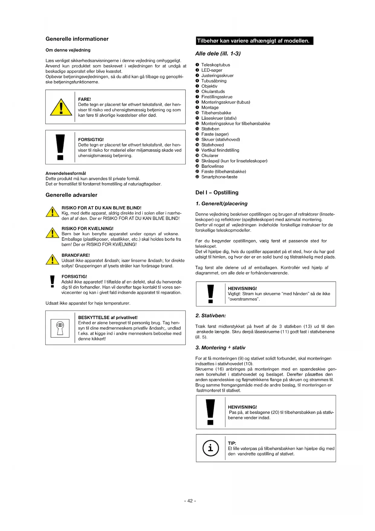 Denne vejledning beskriver opstillingen og brugen af refraktorer (linsete- leskoper) og reflektorer (spejlteleskoper) med azimutal montering. Derfor vil noget af vejledningen indeholde forskellige instrukser for de forskellige teleskopmodeller. Før du begynder opstillingen, vælg først et passende sted for teleskopet. Det vil hjælpe dig, hvis du opstiller apparatet på et sted, hvor du har god udsigt til himlen, og hvor der er en solid bund og tilstrækkelig med plads. Tag først alle delene ud af emballagen. Kontrollér ved hjælp af diagrammet, om alle dele er forhåndenværende. HENVISNING! Vigtigt: Stram kun skruerne “med hånden” så de ikke “overstrammes”.