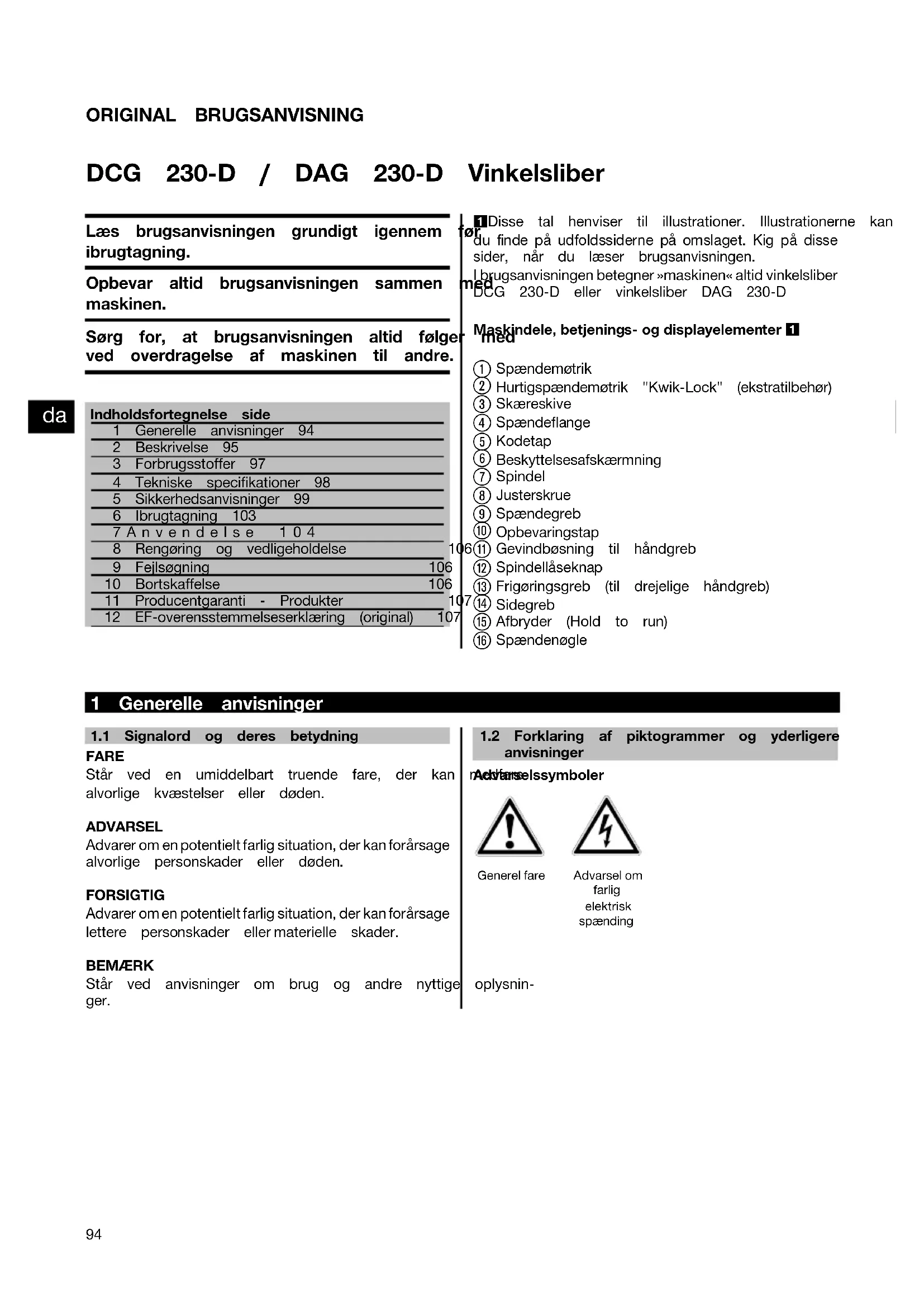 Printed: 20.11.2013 | Doc-Nr: PUB / 5069494 / 000 / 02ORIGINAL BRUGSANVISNING DCG 230‑D / DAG 230‑D Vinkelsliber Læs brugsanvisningen grundigt igennem før ibrugtagning. Opbevar altid brugsanvisningen sammen med maskinen. Sørg for, at brugsanvisningen altid følger med ved overdragelse af maskinen til andre. Indholdsfortegnelse side1 Generelle anvisninger 942 Beskrivelse 953 Forbrugsstoffer 974 Tekniske specifikationer 985 Sikkerhedsanvisninger 996 Ibrugtagning 1037Anvendelse 1048 Rengøring og vedligeholdelse 1069 Fejlsøgning 10610 Bortskaffelse 10611 Producentgaranti - Produkter 10712 EF-overensstemmelseserklæring (original) 1071 Disse tal henviser til illustrationer. Illustrationerne kan dufindepåudfoldssidernepåomslaget.Kigpådisse sider, når du læser brugsanvisningen. I brugsanvisningen betegner »maskinen« altid vinkelsliber DCG 230‑D eller vinkelsliber DAG 230‑D Maskindele, betjenings‑ og displayelementer 1