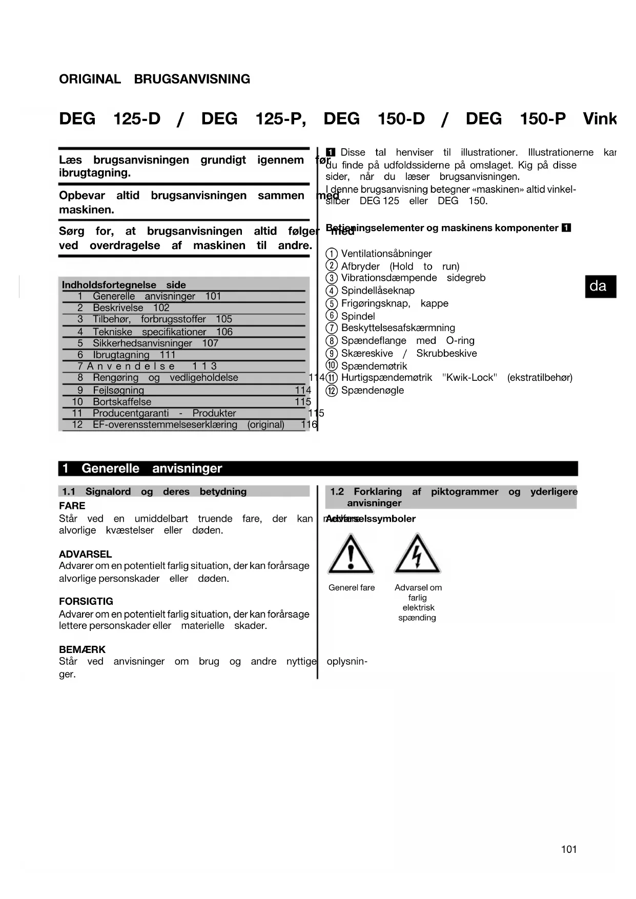 Hilti DEG 125-D/-P, DEG 150-D/-P, Pos.1, Art. Nr.285965/A3, 18.09.2013 Printed: 21.11.2013 | Doc-Nr: PUB / 5162491 / 000 / 00ORIGINAL BRUGSANVISNING DEG 125‑D / DEG 125‑P, DEG 150‑D / DEG 150‑P Vinkelsliber Læs brugsanvisningen grundigt igennem før ibrugtagning. Opbevar altid brugsanvisningen sammen med maskinen. Sørg for, at brugsanvisningen altid følger med ved overdragelse af maskinen til andre. Indholdsfortegnelse side1 Generelle anvisninger 1012 Beskrivelse 1023 Tilbehør, forbrugsstoffer 1054 Tekniske specifikationer 1065 Sikkerhedsanvisninger 1076 Ibrugtagning 1117Anvendelse 1138 Rengøring og vedligeholdelse 1149 Fejlsøgning 11410 Bortskaffelse 11511 Producentgaranti - Produkter 11512 EF-overensstemmelseserklæring (original) 1161 Disse tal henviser til illustrationer. Illustrationerne kan dufindepåudfoldssidernepåomslaget.Kigpådisse sider, når du læser brugsanvisningen. I denne brugsanvisning betegner «maskinen» altid vinkel- sliber DEG 125 eller DEG 150. Betjeningselementer og maskinens komponenter 1