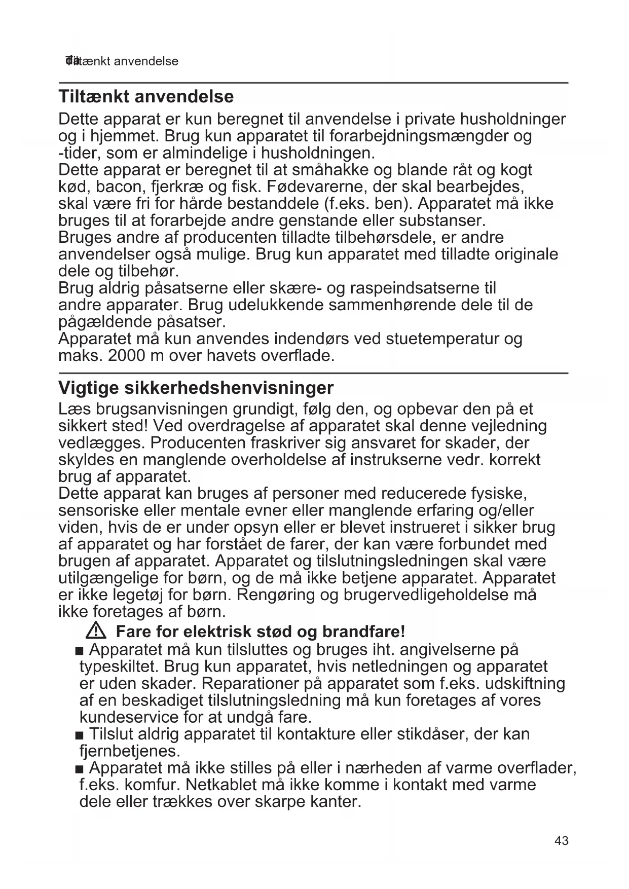Tiltænkt anvendelse Tiltænkt anvendelse Dette apparat er kun beregnet til anvendelse i private husholdninger og i hjemmet. Brug kun apparatet til forarbejdningsmængder og -tider, som er almindelige i husholdningen. Dette apparat er beregnet til at småhakke og blande råt og kogt kød, bacon, fjerkræ og fisk. Fødevarerne, der skal bearbejdes, skal være fri for hårde bestanddele (f.eks. ben). Apparatet må ikke bruges til at forarbejde andre genstande eller substanser. Bruges andre af producenten tilladte tilbehørsdele, er andre anvendelser også mulige. Brug kun apparatet med tilladte originale dele og tilbehør. Brug aldrig påsatserne eller skære- og raspeindsatserne til andre apparater. Brug udelukkende sammenhørende dele til de pågældende påsatser. Apparatet må kun anvendes indendørs ved stuetemperatur og maks. 2000 m over havets overflade. Vigtige sikkerhedshenvisninger Læs brugsanvisningen grundigt, følg den, og opbevar den på et sikkert sted! Ved overdragelse af apparatet skal denne vejledning vedlægges. Producenten fraskriver sig ansvaret for skader, der skyldes en manglende overholdelse af instrukserne vedr. korrekt brug af apparatet. Dette apparat kan bruges af personer med reducerede fysiske, sensoriske eller mentale evner eller manglende erfaring og/eller viden, hvis de er under opsyn eller er blevet instrueret i sikker brug af apparatet og har forstået de farer, der kan være forbundet med brugen af apparatet. Apparatet og tilslutningsledningen skal være utilgængelige for børn, og de må ikke betjene apparatet. Apparatet er ikke legetøj for børn. Rengøring og brugervedligeholdelse må ikke foretages af børn. W Fare for elektrisk stød og brandfare! ■ Apparatet må kun tilsluttes og bruges iht. angivelserne på typeskiltet. Brug kun apparatet, hvis netledningen og apparatet er uden skader. Reparationer på apparatet som f.eks. udskiftning af en beskadiget tilslutningsledning må kun foretages af vores kundeservice for at undgå fare. ■ Tilslut aldrig apparatet til kontakture eller stikdåser, der kan fjernbetjenes. ■ Apparatet må ikke stilles på eller i nærheden af varme overflader, f.eks. komfur. Netkablet må ikke komme i kontakt med varme dele eller trækkes over skarpe kanter.44 da Vigtige sikkerhedshenvisninger ■ Dyp aldrig motorenheden i væske, hold den aldrig ind under rindende vand, og rengør den ikke i opvaskemaskinen. Anvend ikke nogen damprenser. Brug ikke apparatet med fugtige hænder. ■ Apparatet skal efter hver brug, når det ikke er under opsyn, altid afbrydes fra strømnettet, før det samles, adskilles eller rengøres og i tilfælde af fejl. ■ Apparatet skal altid være under opsyn, når det anvendes! W Fare for tilskadekomst! ■ Sæt først netstikket i, når alle forberedelser til arbejdet med apparatet er afsluttet. ■ Forsatserne må kun bruges, når de er helt samlet. Forsatserne må aldrig samles på motorenheden. ■ Før udskiftning af tilbehør eller ekstradele, der bevæges under driften, skal apparatet slukkes og afbrydes fra strømnettet. Drevet kører stadig lidt kort efter, at apparatet er slukket. Vent, til drevet står helt stille. ■ Selv om strømmen skulle svigte, forbliver apparatet tændt og går automatisk i gang igen, når strømmen vender tilbage. ■ Berør aldrig de skarpe knive og kanter på skære- og raspeindsatserne med fingrene. Stik aldrig fingrene ind i roterende dele. Stik aldrig hænderne i påfyldningsskakten eller i udgangsåbningen. ■ Anvend altid stopperen til at skubbe efter med. ■ Rengør aldrig de skarpe knive og kanter på skære- og raspeindsatserne med de bare hænder. W OBS! ■ Sørg for, at der ikke er nogen fremmedlegemer i påfyldningsskakten eller i påsatserne. Anvend ikke genstande (f.eks. knive, skeer) inde i påfyldningsskakten eller udgangsåbningen. ■ Brug aldrig tænd-/sluk-knappen og modsatløb-knappen på samme tid. Vent med at betjene den anden knap, til drevet står helt stille. Apparatet kan blive beskadiget. W Fare for kvælning! ■ Lad ikke børn lege med emballagemateriale. W Vigtigt! Rengør altid apparatet grundigt efter hver brug eller efter længere tid, hvor det ikke har været i brug. X ”Rengøring og pleje” se side 4745