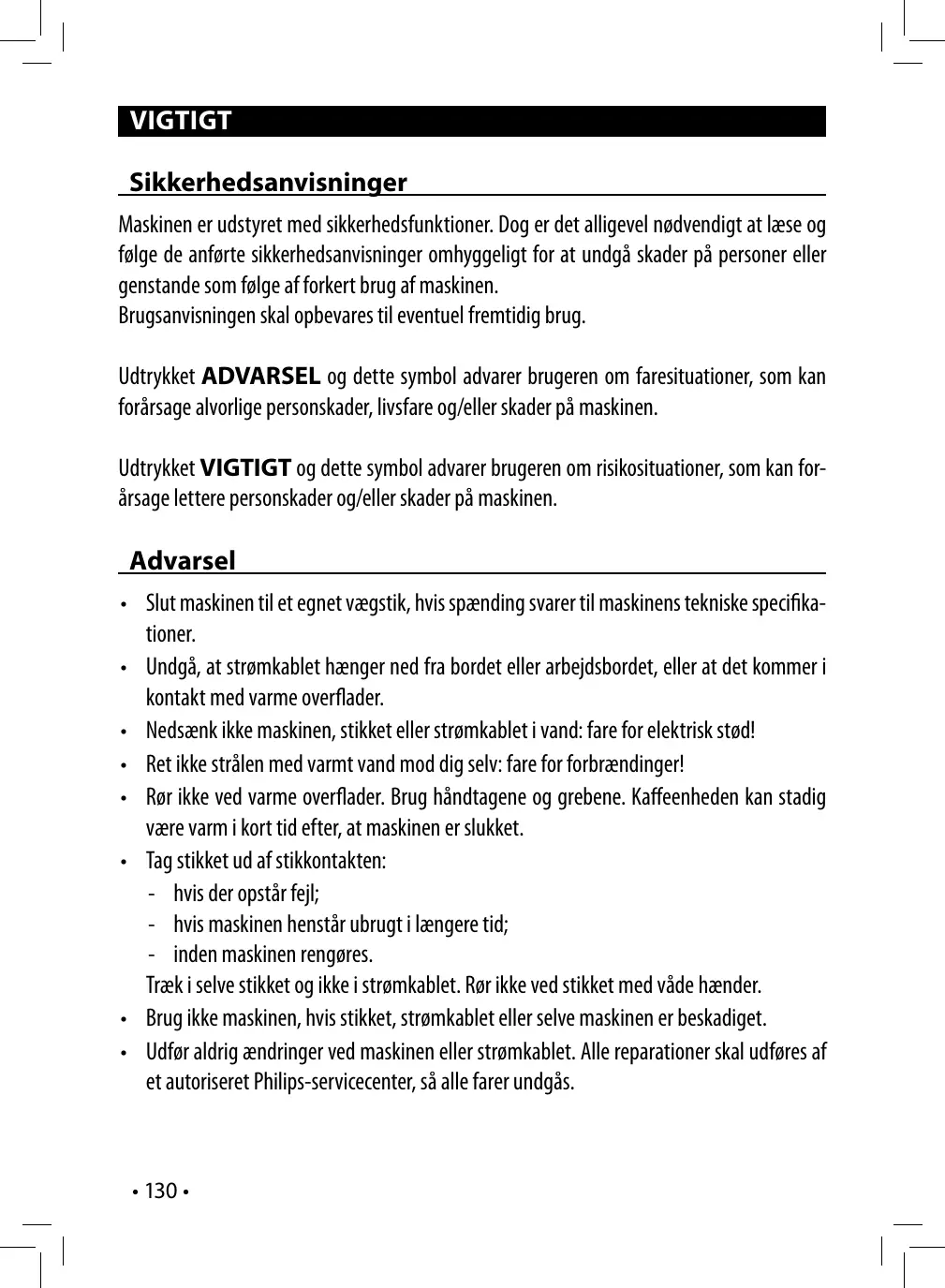 Advarsel • Slut maskinen til et egnet vægstik, hvis spænding svarer til maskinens tekniske specifikationer. • Undgå, at strømkablet hænger ned fra bordet eller arbejdsbordet, eller at det kommer i kontakt med varme overflader. • Nedsænk ikke maskinen, stikket eller strømkablet i vand: fare for elektrisk stød! • Ret ikke strålen med varmt vand mod dig selv: fare for forbrændinger! • Rør ikke ved varme overflader. Brug håndtagene og grebene. Kaffeenheden kan stadig være varm i kort tid efter, at maskinen er slukket. • Tag stikket ud af stikkontakten: - hvis der opstår fejl; - hvis maskinen henstår ubrugt i længere tid; - inden maskinen rengøres. Træk i selve stikket og ikke i strømkablet. Rør ikke ved stikket med våde hænder. • Brug ikke maskinen, hvis stikket, strømkablet eller selve maskinen er beskadiget. • Udfør aldrig ændringer ved maskinen eller strømkablet. Alle reparationer skal udføres af et autoriseret Philips-servicecenter, så alle farer undgås.