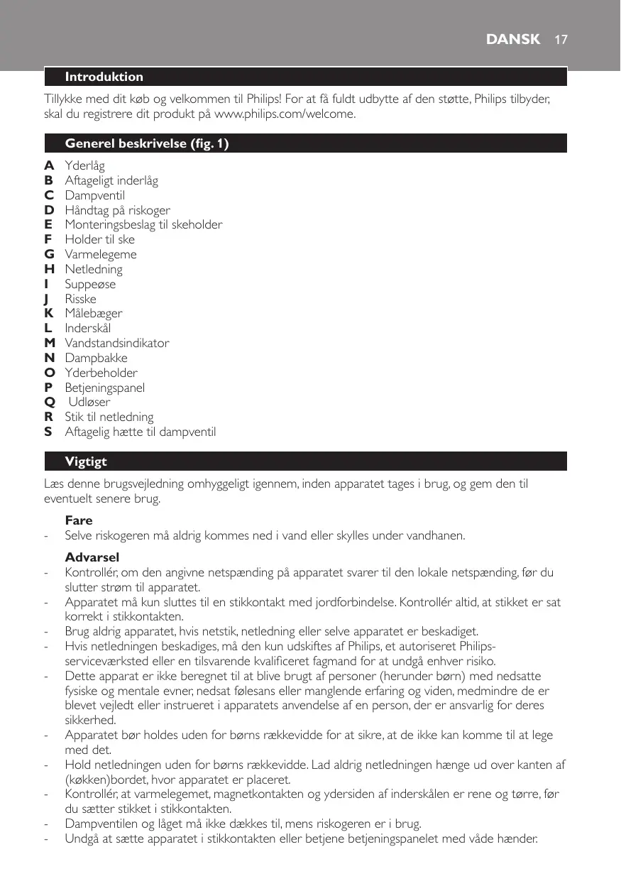 Danger -- Ne plongez jamais le corps du cuiseur à riz dans l’eau et ne le rincez pas sous le robinet. Avertissement -- Avant de brancher l’appareil, vérifiez que la tension indiquée sur l’appareil correspond à la tension secteur locale. -- Branchez l’appareil sur une prise murale mise à la terre. Assurez-vous que la fiche est correctement insérée dans la prise. -- N’utilisez jamais l’appareil si la fiche, le cordon d’alimentation ou l’appareil lui-même est endommagé. -- Si le cordon d’alimentation est endommagé, il doit être remplacé par Philips, un Centre Service Agréé Philips ou un technicien qualifié afin d’éviter tout accident. -- Cet appareil n’est pas destiné à être utilisé par des personnes (notamment des enfants) dont les capacités physiques, sensorielles ou intellectuelles sont réduites, ou par des personnes manquant d’expérience ou de connaissances, à moins que celles-ci ne soient sous surveillance ou qu’elles n’aient reçu des instructions quant à l’utilisation de l’appareil par une personne responsable de leur sécurité. -- Veillez à ce que les enfants ne puissent pas jouer avec l’appareil. -- Maintenez le cordon d’alimentation hors de portée des enfants. Ne le laissez pas dépasser de la table ou du plan de travail sur lequel l’appareil est posé. -- Assurez-vous que l’élément chauffant, l’interrupteur magnétique et l’extérieur de la cuve sont bien propres et secs avant de brancher l’appareil sur la prise secteur.