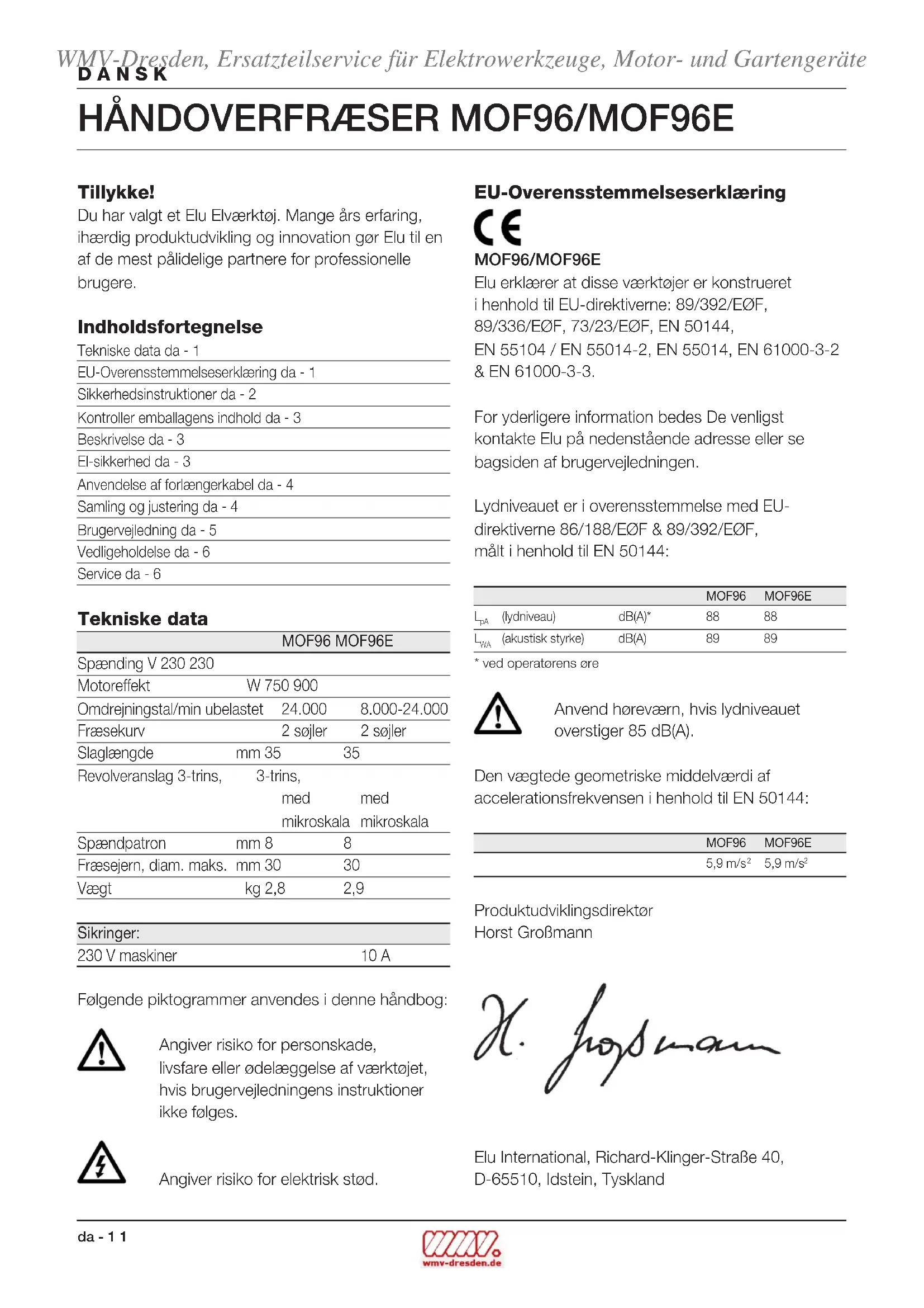 Produktudviklingsdirektør Horst Großmann Elu International, Richard-Klinger-Straße 40, D-65510, Idstein, Tyskland WMV-Dresden, Ersatzteilservice für Elektrowerkzeuge, Motor- und Gartengeräte2 da - 2 DANSK Sikkerhedsinstruktioner Læs brugsanvisningen igennem, inden maskinen tages i brug. Opbevar brugsanvisningen let tilgængeligt, så alle, der bruger maskinen, har adgang til brugsanvisningen. Foruden nedenstående instruktioner, bør Arbejdstilsynets regler altid følges. ADVARSEL! Når man anvender elværktøj, skal følgende grundlæggende sikkerhedsinstruktioner altid følges for at nedsætte risikoen for elektriske stød, personskader og brand. 1 Brug høreværn Lydniveauet ved bearbejdning af forskellige materialer kan variere, af og til overstiger niveauet 85 dB(A). For at beskytte sig selv, skal man altid anvende høreværn. 2 Hold arbejdsområdet i orden Uordentlige arbejdsområder og arbejdsbænke indbyder til skader. 3 Tænk på arbejdsmiljøets indflydelse Udsæt ikke elværktøj for regn. Anvend ikke elværktøj på fugtige eller våde pladser. Sørg for en god belysning over arbejdsområdet. Anvend ikke elværktøj i nærheden af let antændelige væsker eller gasser. 4 Beskyt dig mod elektriske stød Undgå kropskontakt med dele, der har jordforbindelse (f.eks. rør, radiatorer, komfurer, køleskabe). Ved ekstreme arbejdsforhold (f.eks. høj fugtighed, forekomst af metalstøv osv.) kan den elektriske sikkerhed øges ved at tilkoble en fejlstrømsafbryder. 5 Hold børnene på afstand Lad ikke børn komme i berøring med værktøjet eller forlængerledningen. Det er påkrævet at holde børn under 16 år under opsyn. 6 Opbevar værktøj sikkert Når elværktøjet ikke anvendes, skal det opbevares på et tørt, højt placeret sted, låst inde, uden for børns rækkevidde. 7 Overbelast ikke elværktøj Man arbejder bedre og mere sikkert inden for det anførte effektområde. 8 Brug det rigtige elværktøj Tving ikke elværktøj til at udføre arbejde, som er beregnet til kraftigere værktøj. Brug ikke værktøj til formål, det ikke er beregnet til, brug f.eks. ikke en håndrundsav til at save kviste ellerbrænde. 9 Klæd dig rigtigt på Bær ikke løst hængende tøj eller smykker. De kan sidde fast i bevægelige dele. Gummihandsker og skridsikre sko anbefales ved udendørs arbejde. Brug hårnet, hvis du har langt hår. 10 Brug beskyttelsesbriller Brug beskyttelsesbriller for at forhindre, at du får støv i øjnene, hvilket kan forårsage skade. Hvis der opstår meget støv, bruges også støvmaske. 11 Ledningen må ikke mishandles Bær aldrig værktøjet i ledningen og træk ikke i ledningen for at tage kontakten ud af stikket. Udsæt ikke ledningen for varme, olie eller skarpe kanter. 12 Sæt arbejdsemnet fast Brug skruetvinger eller skruestik for at spænde arbejdsemnet fast. Det er sikrere end at bruge hånden, og du får begge hænder fri til arbejdet. 13 Stræk dig ikke for meget Sørg for, at du altid har sikkert fodfæste og balance. 14 Vedligehold værktøjet omhyggeligt Hold værktøjet skarpt og rent. Følg instruktionerne med hensyn til pasning og udskiftning af tilbehør. Kontroller elværktøjets ledning regelmæssigt og få den repareret hos et anerkendt serviceværksted, hvis den er beskadiget. Kontroller forlængerledninger regelmæssigt og udskift dem, hvis de er beskadigede. Hold håndtagene tørre, rene og fri for olie og fedt. 15 Tag kontakten ud af stikket når elværktøjet ikke er i brug, inden service og ved udskiftning af tilbehør 16 Fjern nøglerne Kontroller at nøgler og justerværktøj er fjernet fra elværktøjet, inden det startes. 17 Undgå utilsigtet start Bær ikke tændt elværktøj med fingeren på afbryderen. Sørg for, at afbryderen er slået fra, når du sætter kontakten i stikket. 18 Forlængerledninger udendørs Udendørs må der kun anvendes forlængerledninger, der er godkendt til udendørs brug og mærkede til dette. WMV-Dresden, Ersatzteilservice für Elektrowerkzeuge, Motor- und Gartengeräteda - 3 3 DANSK 19 Vær opmærksom Se på det, du gør. Brug din sunde fornuft. Brug ikke elværktøjet, når du er træt. 20 Kontroller elværktøjet for skader, inden du tilslutter ledningen til vægstikket Inden fortsat brug af elværktøjet, skal eventuelle beskadigede sikringsanordninger og andre defekte dele kontrolleres nøje for at finde ud af, om de fortsat kan fungere rigtigt og udføre den planlagte funktion. Kontroller at de bevægelige dele fungerer upåklageligt og ikke klemmer, at ingen dele er gået i stykker, at alle dele er rigtigt monterede, og at andre forhold, der kan påvirke driften, er i orden. En sikkerhedsanordning eller en anden del, som er beskadiget, skal repareres eller udskiftes af et anerkendt serviceværksted, hvis intet andet er anført i brugsanvisningen. Fejlbehæftede afbrydere skal udskiftes hos et autoriseret serviceværksted. Brug ikke elværktøjet, hvis afbryderen ikke kan kobles til eller fra. 21 For din personlige sikkerhed Brug kun tilbehør og dele, der er anbefalet i brugsanvisningen og katalogerne. Anvendelsen af andet værktøj eller tilbehør end det, der anbefales i brugsanvisningen eller katalogerne kan medføre risiko for personskader. 22 Få dit værktøj repareret hos et autoriseret Elu Serviceværksted Dette elværktøj overholder de relevante sikkerhedsforskrifter. For at undgå fare, må reparationer af eludstyr kun foretages af autoriserede elektrikere. Yderligere sikkerhedsanvisninger for fræseværktøj