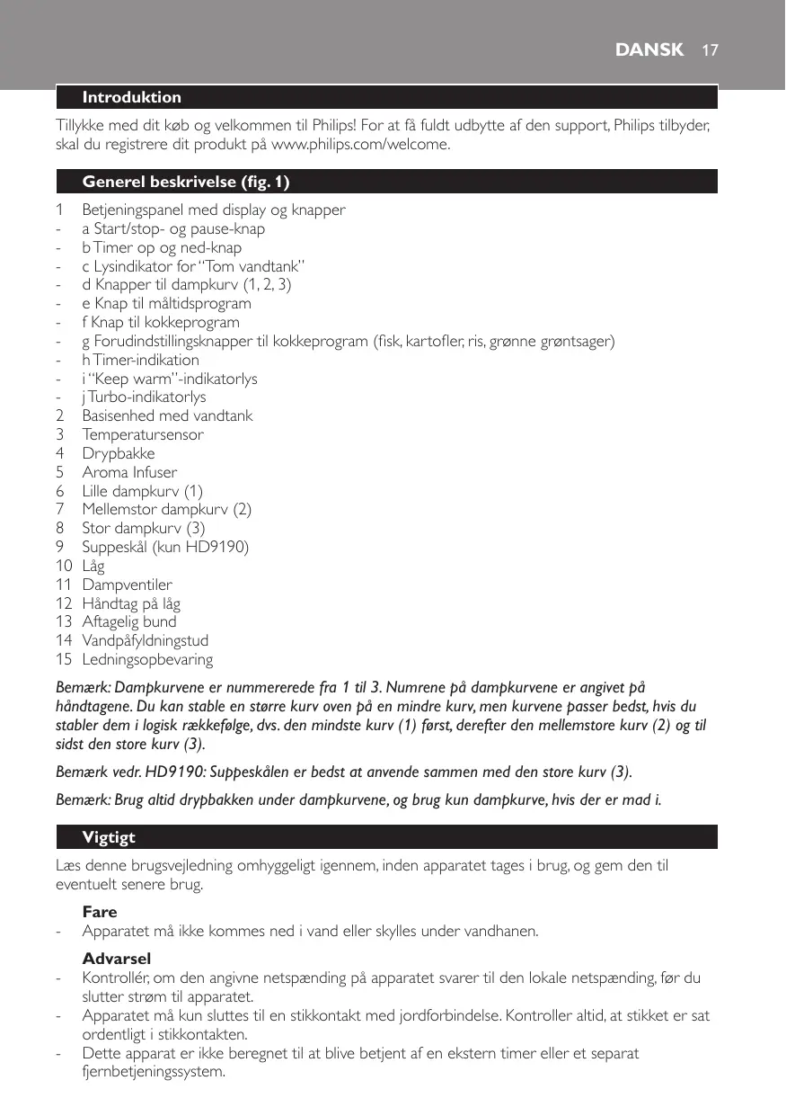 HD9190/30 - Elektrisk dampkoger PHILIPS - Gratis brugsanvisning og manual