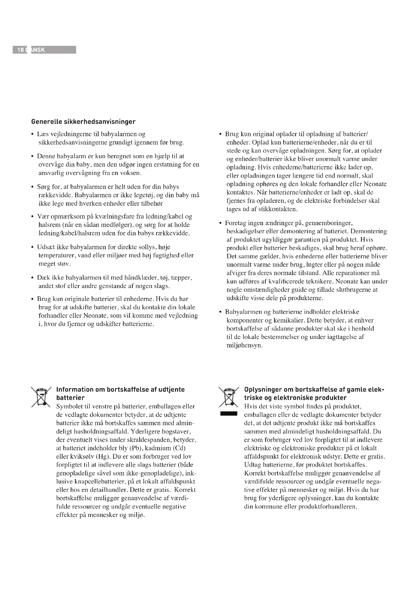 - Babyalarmen og batterierne indholder elektriske komponenter og kemikalier. Dette betyder, at enhver bortskaffelse af sådanne produkter skal ske i henhold til de lokale bestemmelser og under iagttagelse af miljøhensyn.19 Advarsel! Batterier kræver hensyn. Når du oplader et batteri, er der altid en risiko for, at en kort- slutning eller en fabriksfejl kan få batteriet til at overophede eller bryde i brand. Vi anbefaler derfor varmt, at du aldrig lader et batteri ude af syne. Advarsel!