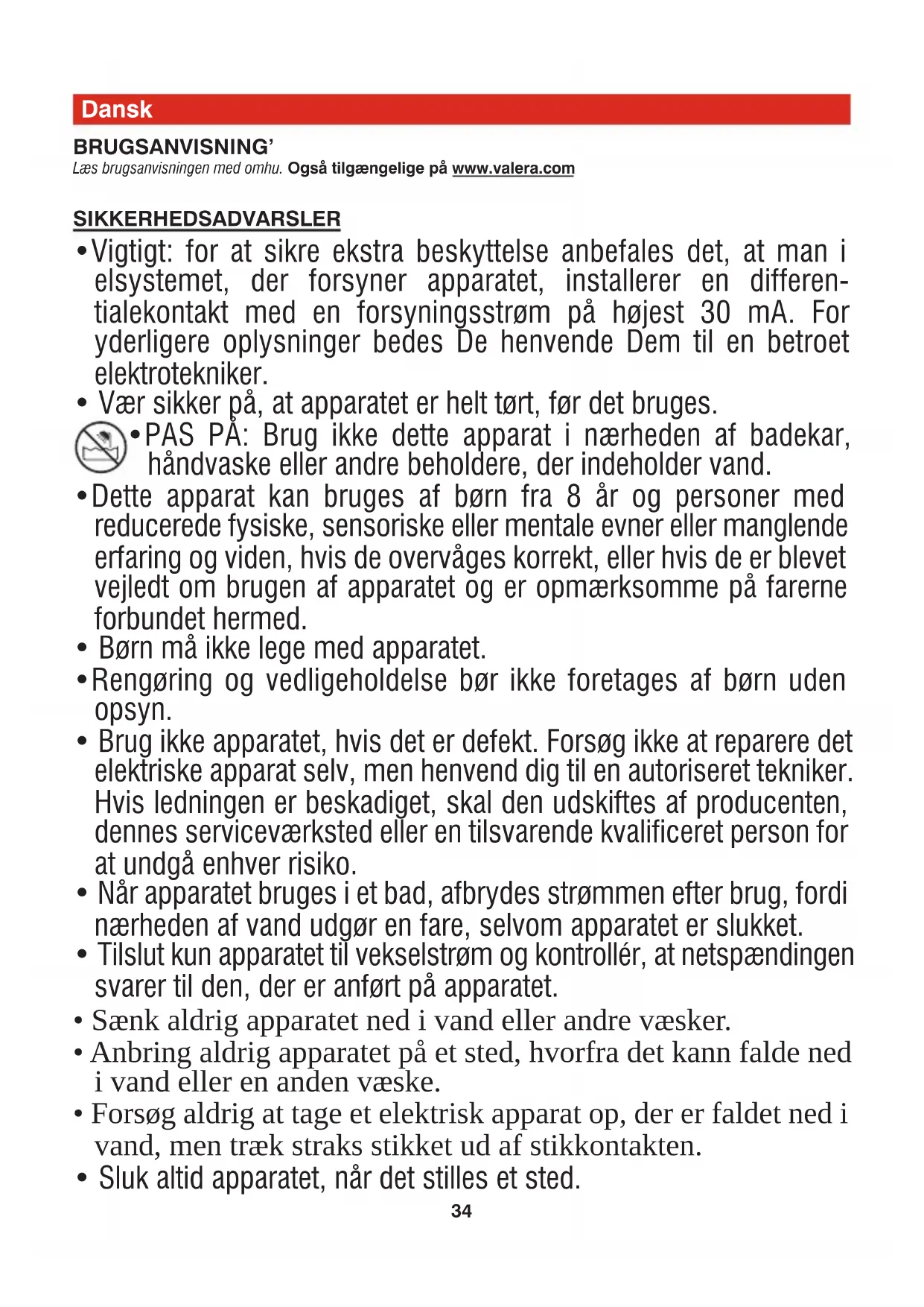 Før rengøring skal stikket altid taget ud af stikkontakten! Rengør apparatet med en klud fugtet med vand. Kom aldrig apparatet ned i vand eller en væske! Beskyt apparatet mod støv. Om nødvendigt rengøres luftindgangs- og udgangsgitrene med en børste eller pensel. PAS PÅ: Det er absolut forbudt at rengøre hårtørreren med rengøringsmidler, opløsningsmidler og diverse kemikalier. Med forbehold for ændringer Garanti VALERA garanterer apparatet, som De har købt, på følgende betingelser: