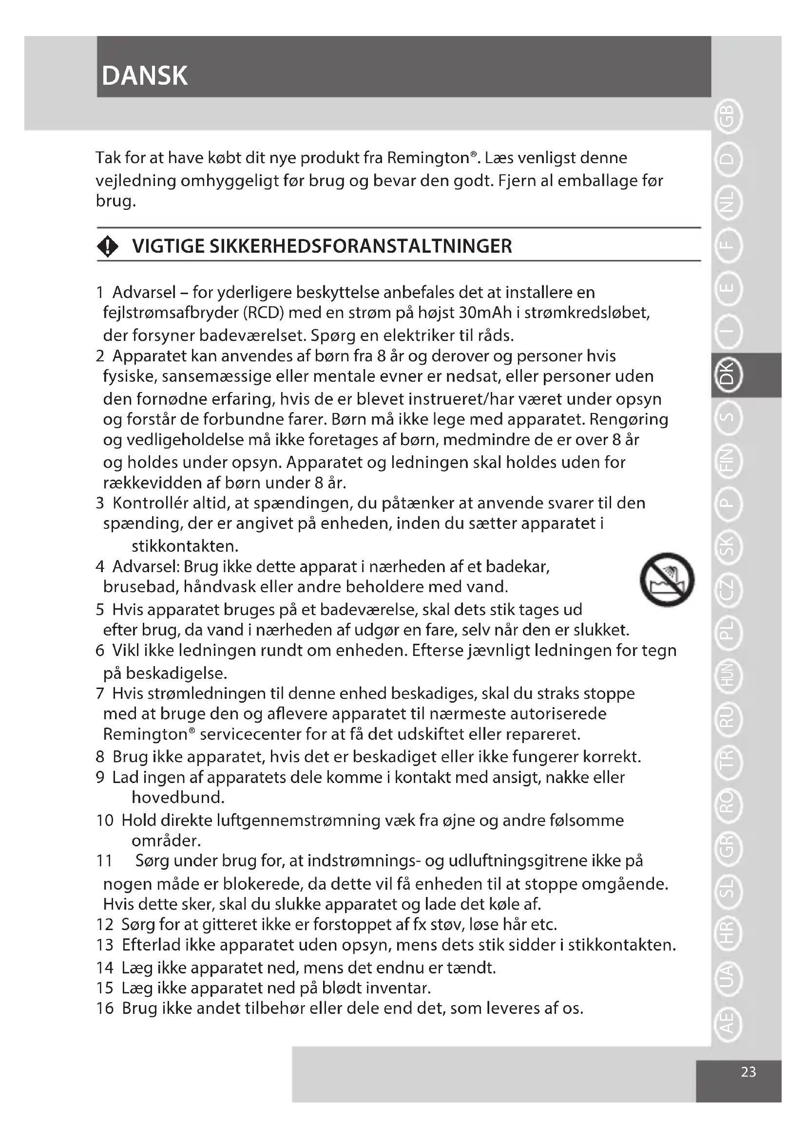 Tak for at have kobeit dit nye produit fra Remington. Laes venligst denne vegledning omhyggeligt fbrug og bevar den godt. Fjern al emballage for brug.
