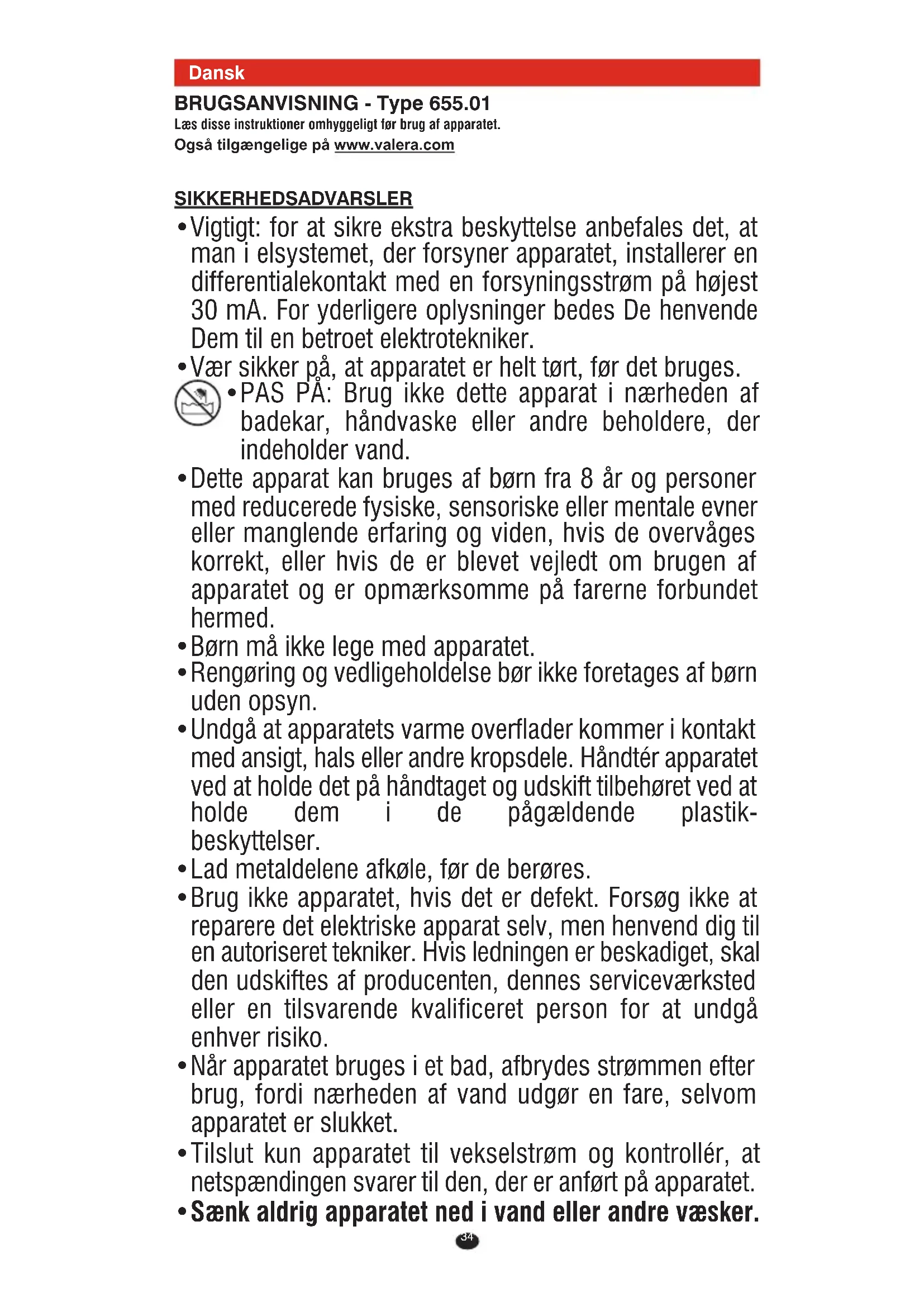 Før apparatet rengøres, skal stikket altid tages ud af stikkontakten! Lad apparatet afkøle, før det rengøres. Apparatet kan rengøres med en fugtig klud, men kom det aldrig ned i vand eller en anden væske! Dette apparat overholder EU-direktiverne 2004/108/EØF, 2006/95/EØF, 2009/125/EØF og regulativ (EF) nr. 1275/2008. GARANTI VALERA garanterer apparatet, som De har købt, på følgende betingelser:
