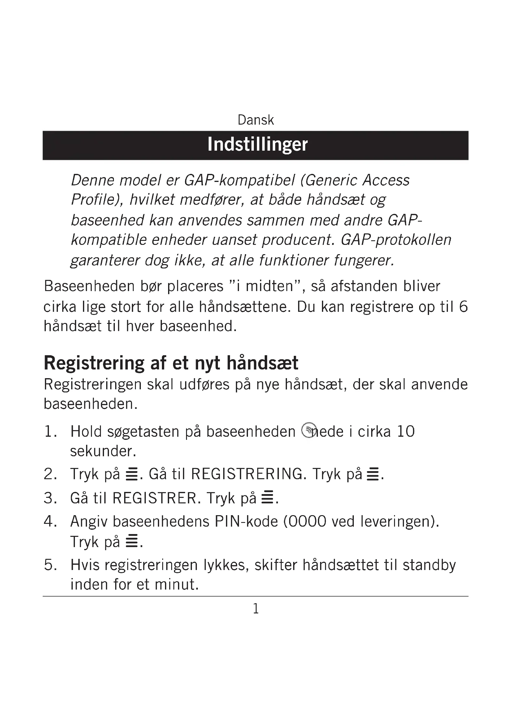 Baseenheden bør placeres "i midten", sä afstanden bliver cirka lige stort for alle händsættene. Du kan registrere op til 6 händsæt til hv er baseenhed.