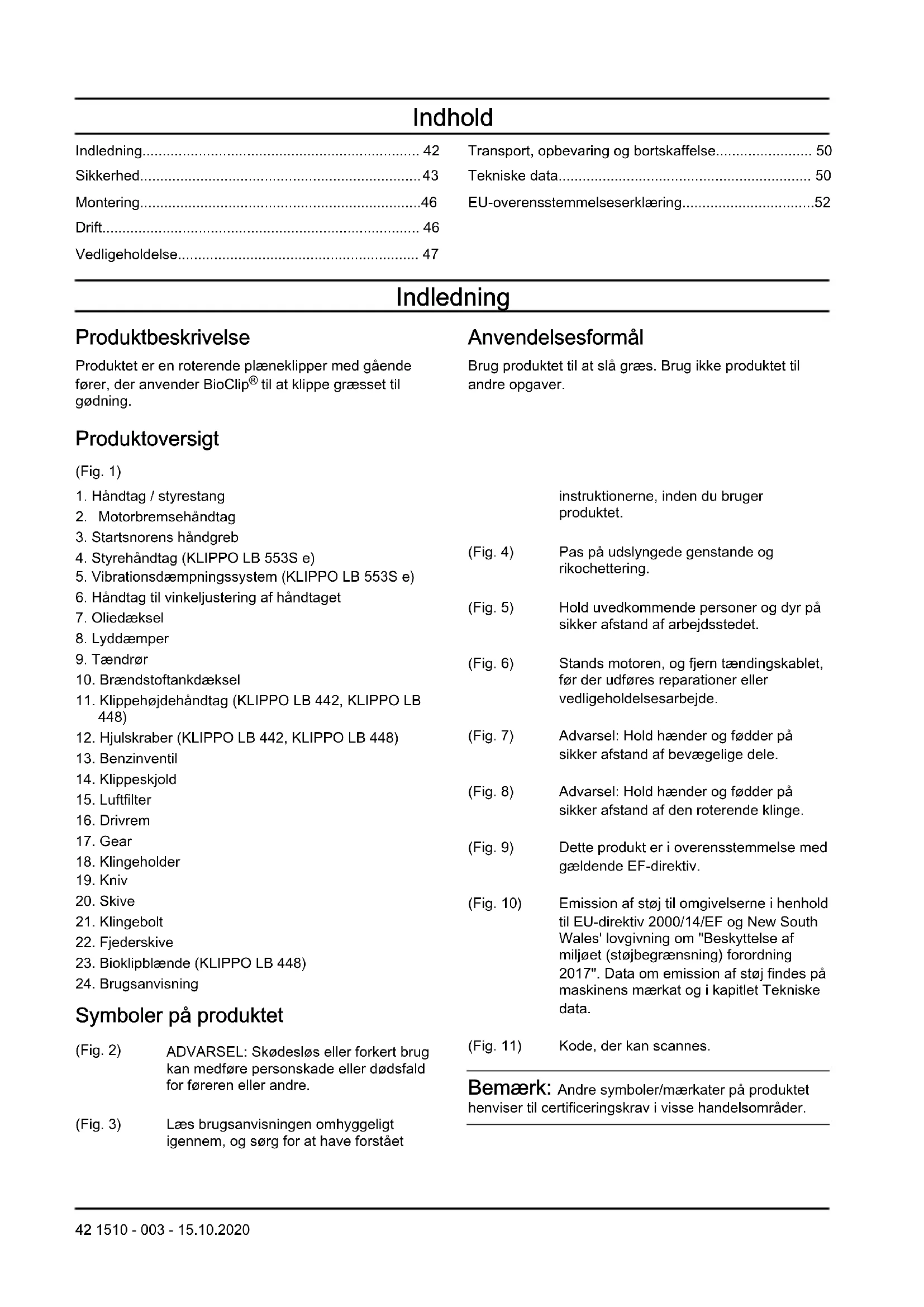 Symboler på produktet (Fig. 2) ADVARSEL: Skødesløs eller forkert brug kan medføre personskade eller dødsfald for føreren eller andre. (Fig. 3) Læs brugsanvisningen omhyggeligt igennem, og sørg for at have forstået instruktionerne, inden du bruger produktet. (Fig. 4) Pas på udslyngede genstande og rikochettering. (Fig. 5) Hold uvedkommende personer og dyr på sikker afstand af arbejdsstedet. (Fig. 6) Stands motoren, og fjern tændingskablet, før der udføres reparationer eller vedligeholdelsesarbejde. (Fig. 7) Advarsel: Hold hænder og fødder på sikker afstand af bevægelige dele. (Fig. 8) Advarsel: Hold hænder og fødder på sikker afstand af den roterende klinge. (Fig. 9) Dette produkt er i overensstemmelse med gældende EF-direktiv. (Fig. 10) Emission af støj til omgivelserne i henhold til EU-direktiv 2000/14/EF og New South Wales' lovgivning om "Beskyttelse af miljøet (støjbegrænsning) forordning 2017". Data om emission af støj findes på maskinens mærkat og i kapitlet Tekniske data. (Fig. 11) Kode, der kan scannes. Bemærk: Andre symboler/mærkater på produktet henviser til certificeringskrav i visse handelsområder. 42 1510 - 003 - 15.10.2020Euro V-emissioner ADVARSEL: Ved manipulation af motoren bortfalder EU-typegodkendelsen af dette produkt. Produktansvar Som nævnt i produktansvarsbestemmelserne hæfter vi ikke for skader forårsaget af vores produkt, hvis: