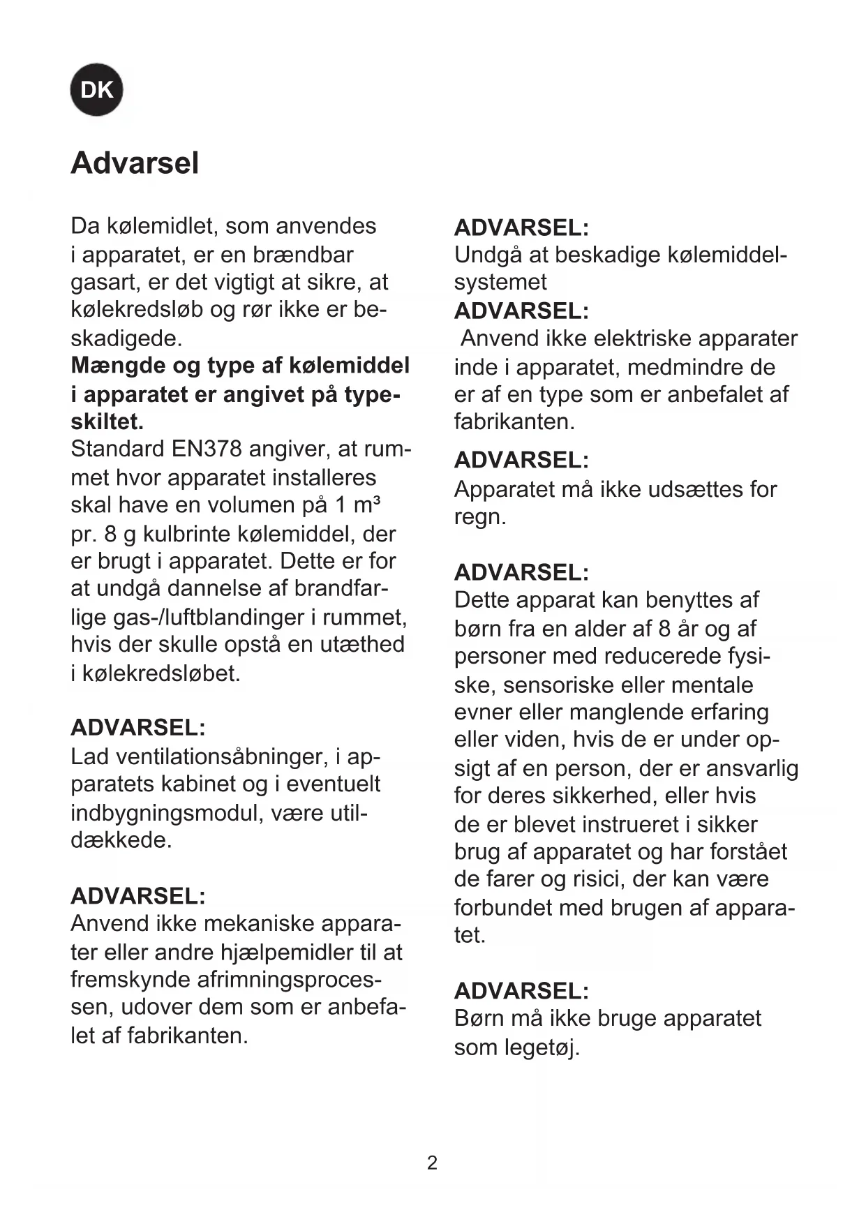 Advarsel Da kølemidlet, som anvendes i apparatet, er en brændbar gasart, er det vigtigt at sikre, at kølekredsløb og rør ikke er be- skadigede. Mængde og type af kølemiddel i apparatet er angivet på type- skiltet. Standard EN378 angiver, at rum- met hvor apparatet installeres skal have en volumen på 1 m³ pr. 8 g kulbrinte kølemiddel, der er brugt i apparatet. Dette er for at undgå dannelse af brandfar- lige gas-/luftblandinger i rummet, hvis der skulle opstå en utæthed i kølekredsløbet. ADVARSEL: Lad ventilationsåbninger, i ap- paratets kabinet og i eventuelt indbygningsmodul, være util- dækkede. ADVARSEL: Anvend ikke mekaniske appara- ter eller andre hjælpemidler til at fremskynde afrimningsproces- sen, udover dem som er anbefa- let af fabrikanten. ADVARSEL: Undgå at beskadige kølemiddel- systemet ADVARSEL: Anvend ikke elektriske apparater inde i apparatet, medmindre de er af en type som er anbefalet af fabrikanten. ADVARSEL: Apparatet må ikke udsættes for regn. ADVARSEL: Dette apparat kan benyttes af børn fra en alder af 8 år og af personer med reducerede fysi- ske, sensoriske eller mentale evner eller manglende erfaring eller viden, hvis de er under op- sigt af en person, der er ansvarlig for deres sikkerhed, eller hvis de er blevet instrueret i sikker brug af apparatet og har forstået de farer og risici, der kan være forbundet med brugen af appara- tet. ADVARSEL: Børn må ikke bruge apparatet som legetøj.3