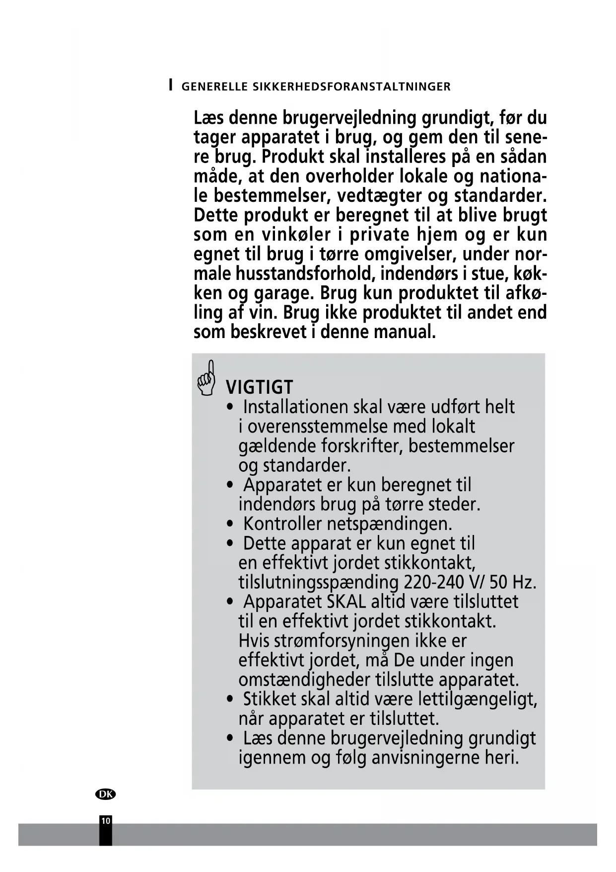 Læs denne brugervejledning grundigt, før du tager apparatet i brug, og gem den til sene- re brug. Produkt skal installeres på en sådan måde, at den overholder lokale og nationa- le bestemmelser, vedtægter og standarder. Dette produkt er beregnet til at blive brugt som en vinkøler i private hjem og er kun egnet til brug i tørre omgivelser, under nor- male husstandsforhold, indendørs i stue, køk- ken og garage. Brug kun produktet til afkø- ling af vin. Brug ikke produktet til andet end som beskrevet i denne manual.