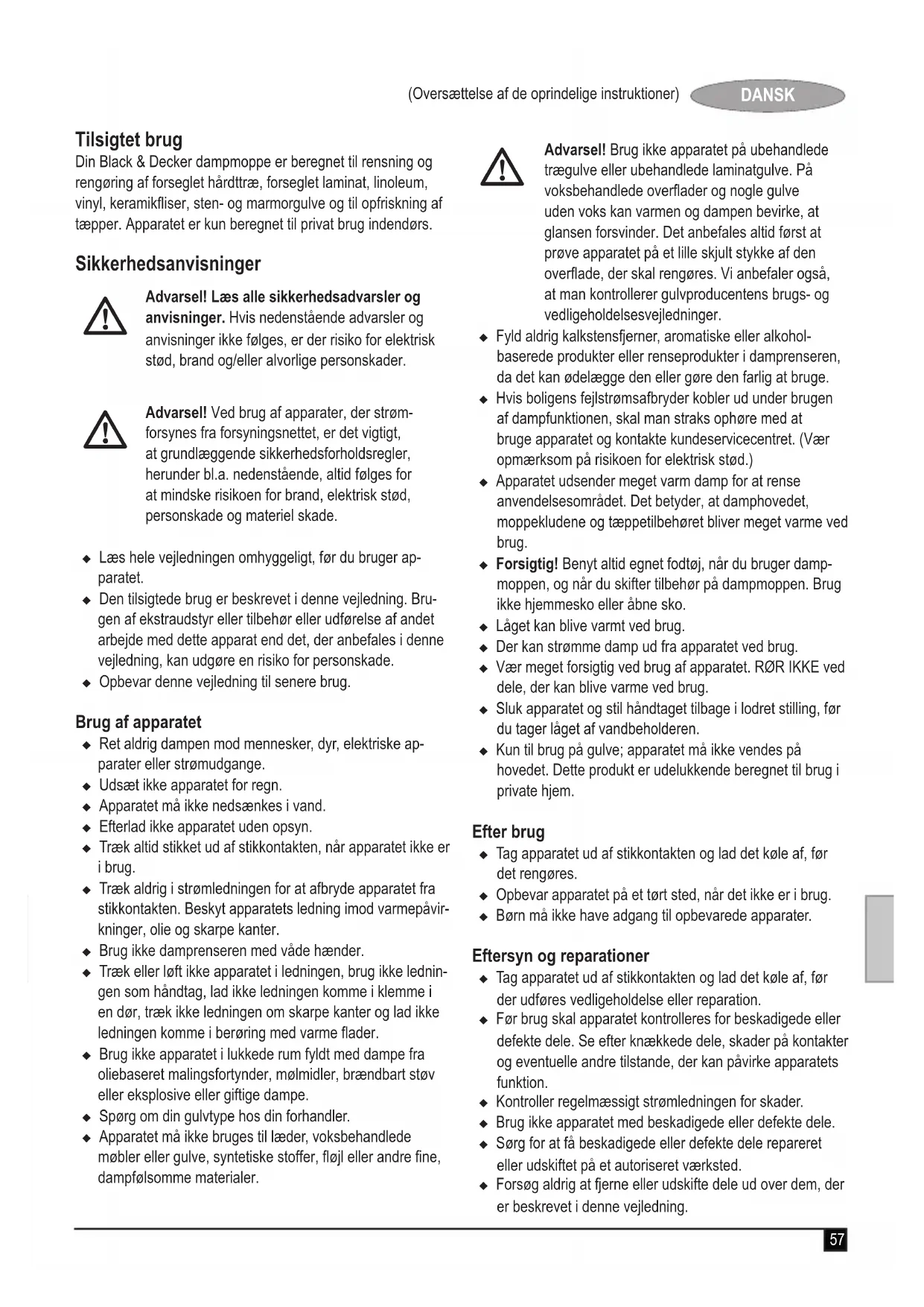 Din Black & Decker dampmotpe er beregnet til rennsing og rengering af forseglet hardtræ, forseglet laminat, linoleum, vinyl, keramikfliser, sten- og marmorgulve og til opfriskning af tæpper. Apparatet er kun beregnet til privat brug indendørs.