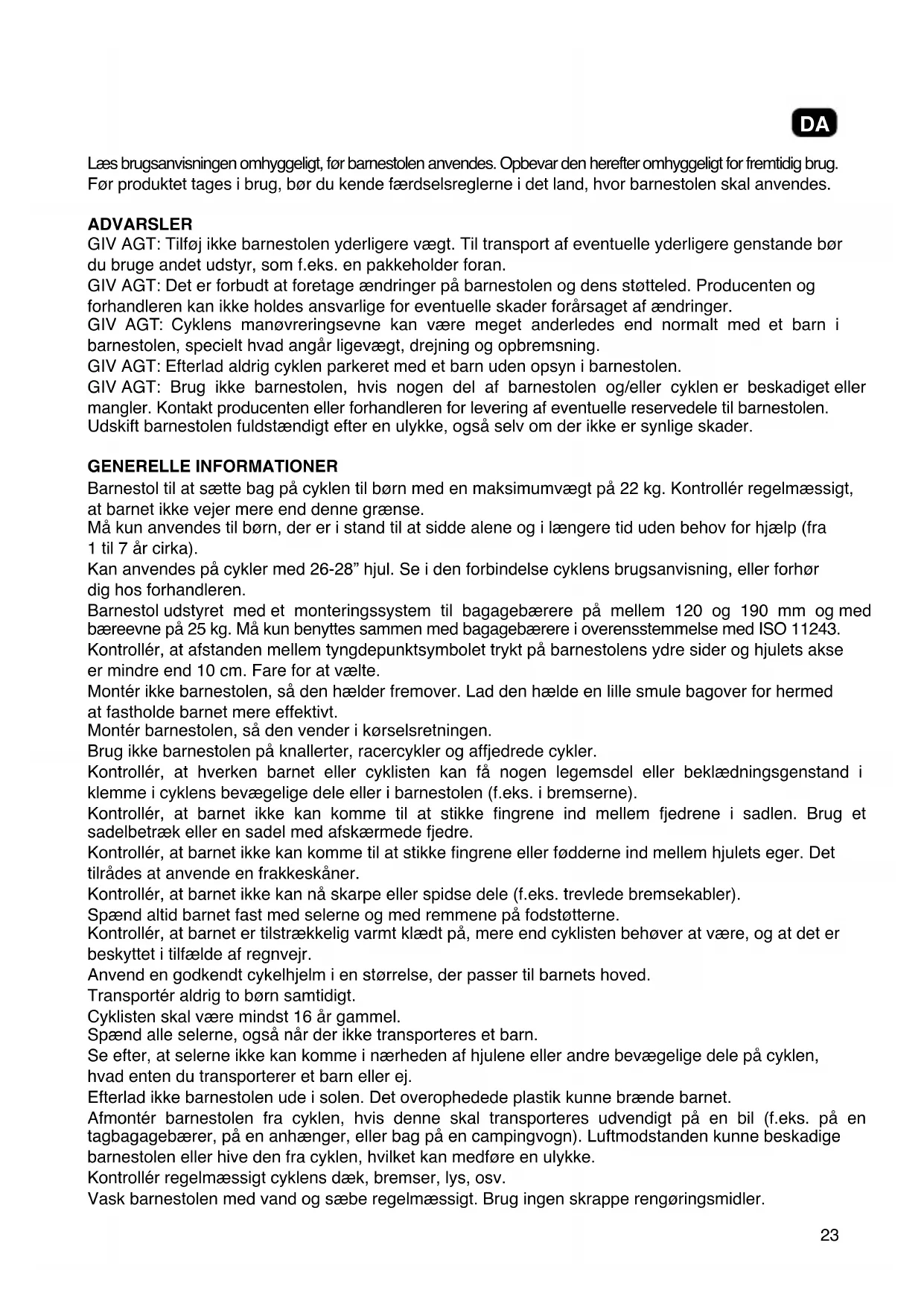 NL23 Læs brugsanvisningen omhyggeligt, før barnestolen anvendes. Opbevar den herefter omhyggeligt for fremtidig brug. Før produktet tages i brug, bør du kende færdselsreglerne i det land, hvor barnestolen skal anvendes. ADVARSLER GIV AGT: Tilføj ikke barnestolen yderligere vægt. Til transport af eventuelle yderligere genstande bør du bruge andet udstyr, som f.eks. en pakkeholder foran. GIV AGT: Det er forbudt at foretage ændringer på barnestolen og dens støtteled. Producenten og forhandleren kan ikke holdes ansvarlige for eventuelle skader forårsaget af ændringer. GIV AGT: Cyklens manøvreringsevne kan være meget anderledes end normalt med et barn i barnestolen, specielt hvad angår ligevægt, drejning og opbremsning. GIV AGT: Efterlad aldrig cyklen parkeret med et barn uden opsyn i barnestolen. GIV AGT: Brug ikke barnestolen, hvis nogen del af barnestolen og/eller cyklen er beskadiget eller mangler. Kontakt producenten eller forhandleren for levering af eventuelle reservedele til barnestolen. Udskift barnestolen fuldstændigt efter en ulykke, også selv om der ikke er synlige skader. GENERELLE INFORMATIONER Barnestol til at sætte bag på cyklen til børn med en maksimumvægt på 22 kg. Kontrollér regelmæssigt, at barnet ikke vejer mere end denne grænse. Må kun anvendes til børn, der er i stand til at sidde alene og i længere tid uden behov for hjælp (fra 1 til 7 år cirka). Kan anvendes på cykler med 26-28” hjul. Se i den forbindelse cyklens brugsanvisning, eller forhør dig hos forhandleren. Barnestol udstyret med et monteringssystem til bagagebærere på mellem 120 og 190 mm og med bæreevne på 25 kg. Må kun benyttes sammen med bagagebærere i overensstemmelse med ISO 11243. Kontrollér, at afstanden mellem tyngdepunktsymbolet trykt på barnestolens ydre sider og hjulets akse er mindre end 10 cm. Fare for at vælte. Montér ikke barnestolen, så den hælder fremover. Lad den hælde en lille smule bagover for hermed at fastholde barnet mere effektivt. Montér barnestolen, så den vender i kørselsretningen. Brug ikke barnestolen på knallerter, racercykler og affjedrede cykler. Kontrollér, at hverken barnet eller cyklisten kan få nogen legemsdel eller beklædningsgenstand i klemme i cyklens bevægelige dele eller i barnestolen (f.eks. i bremserne). Kontrollér, at barnet ikke kan komme til at stikke ngrene ind mellem fjedrene i sadlen. Brug et sadelbetræk eller en sadel med afskærmede fjedre. Kontrollér, at barnet ikke kan komme til at stikke ngrene eller fødderne ind mellem hjulets eger. Det tilrådes at anvende en frakkeskåner. Kontrollér, at barnet ikke kan nå skarpe eller spidse dele (f.eks. trevlede bremsekabler). Spænd altid barnet fast med selerne og med remmene på fodstøtterne. Kontrollér, at barnet er tilstrækkelig varmt klædt på, mere end cyklisten behøver at være, og at det er beskyttet i tilfælde af regnvejr. Anvend en godkendt cykelhjelm i en størrelse, der passer til barnets hoved. Transportér aldrig to børn samtidigt. Cyklisten skal være mindst 16 år gammel. Spænd alle selerne, også når der ikke transporteres et barn. Se efter, at selerne ikke kan komme i nærheden af hjulene eller andre bevægelige dele på cyklen, hvad enten du transporterer et barn eller ej. Efterlad ikke barnestolen ude i solen. Det overophedede plastik kunne brænde barnet. Afmontér barnestolen fra cyklen, hvis denne skal transporteres udvendigt på en bil (f.eks. på en tagbagagebærer, på en anhænger, eller bag på en campingvogn). Luftmodstanden kunne beskadige barnestolen eller hive den fra cyklen, hvilket kan medføre en ulykke. Kontrollér regelmæssigt cyklens dæk, bremser, lys, osv. Vask barnestolen med vand og sæbe regelmæssigt. Brug ingen skrappe rengøringsmidler. DA24