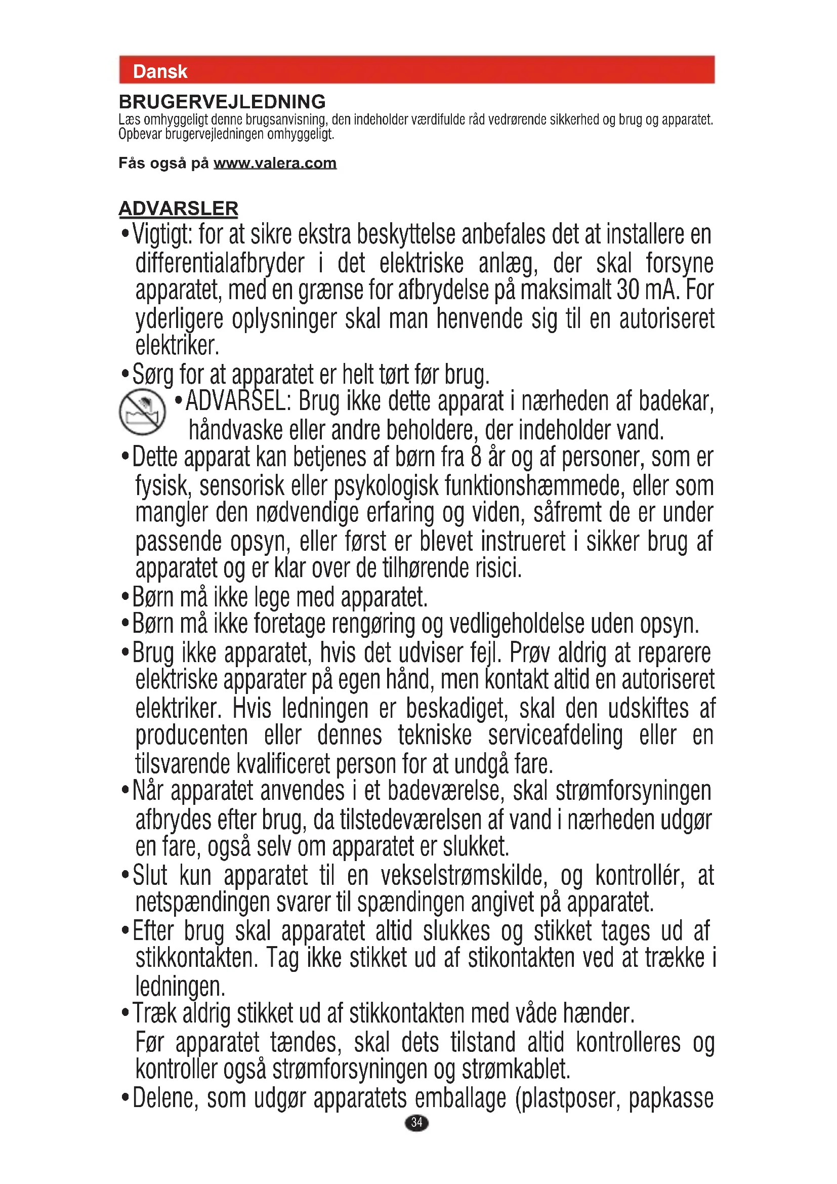- ADVARSEL: Brug ikke dette apparat i nærheden af badekar, håndvaske eller andre beholdere, der indeholder vand.