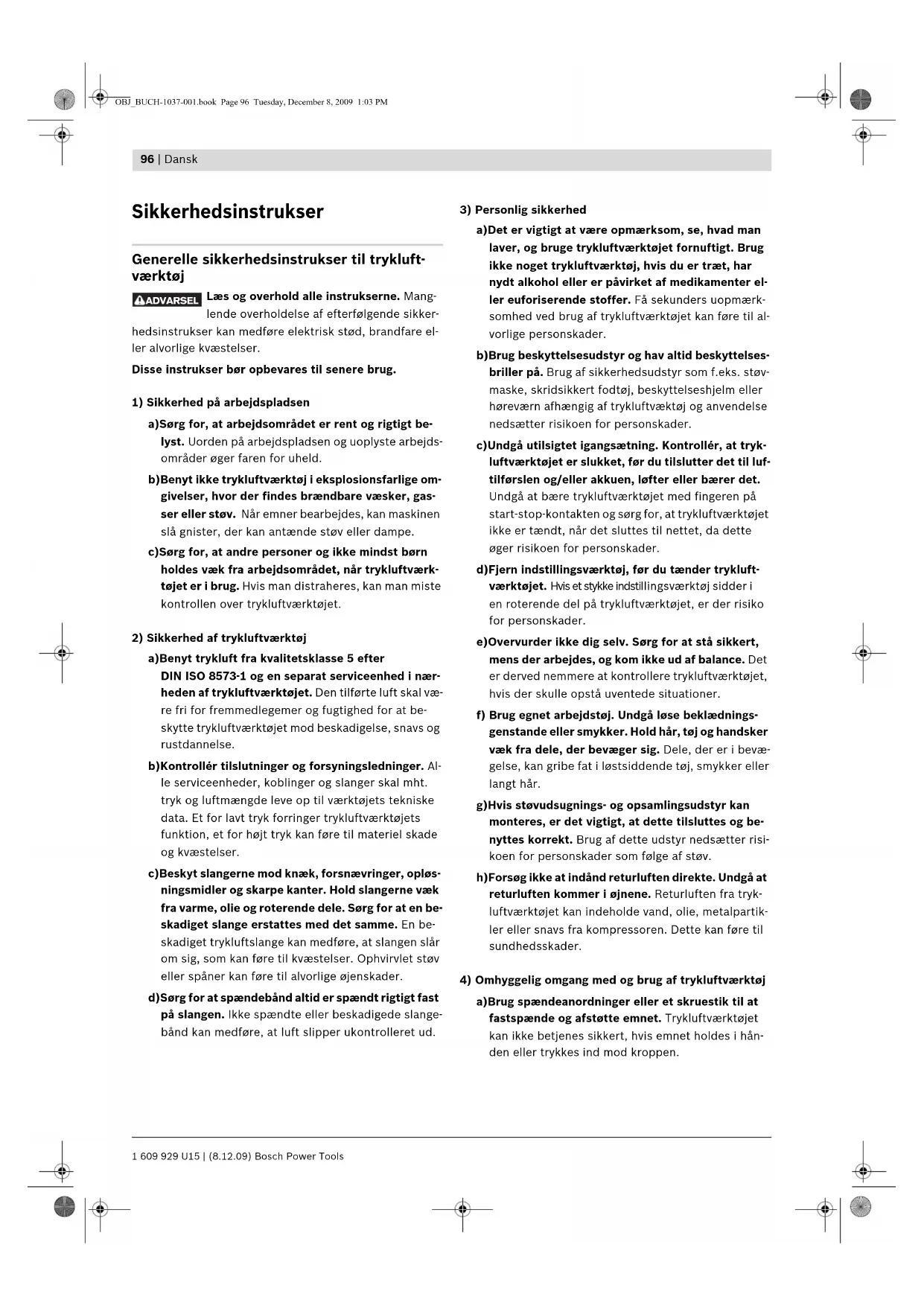 a)Brug spændeanordninger eller et skruestik til at fastspænde og afstøtte emnet. Trykluftværktøjet kan ikke betjenes sikkert, hvis emnet holdes i hån- den eller trykkes ind mod kroppen. ADVARSEL OBJ_BUCH-1037-001.book Page 96 Tuesday, December 8, 2009 1:03 PMDansk | 97 Bosch Power Tools 1 609 929 U15 | (8.12.09) b)Undgå at overbelaste trykluftværktøjet. Brug altid et trykluftværktøj, der er beregnet til det stykke arbejde, der skal udføres. Med det passende tryk- luftværktøj arbejder man bedst og mest sikkert in- den for det angivne effektområde. c)Brug ikke et trykluftværktøj, hvis start-stop-kon- takten er defekt. Et trykluftværktøj, der ikke kan startes og stoppes, er farlig og skal repareres. d)Afbryd luftforsyningen, før der foretages indstillin- ger på værktøjet, før tilbehørsdele udskiftes eller før trykluftværktøjet tages ud af brug i længere tid. Disse sikkerhedsforanstaltninger forhindrer en utilsigtet start af trykluftværktøjet. e)Opbevar ubenyttet trykluftværktøj uden for børns rækkevidde. Lad aldrig personer, der ikke er for- trolige med trykluftværktøjet eller ikke har gen- nemlæst disse instrukser, benytte trykluftværktø- jet. Trykluftværktøj er farlige, hvis det benyttes af ukyndige personer. f) Trykluftværktøjet bør vedligeholdes omhyggeligt. Kontroller, om bevægelige dele fungerer korrekt og ikke sidder fast, og om delene er brækket eller beskadiget, så trykluftværktøjets funktion påvir- kes. Få beskadigede dele repareret, inden trykluft- værktøjet tages i brug. Mange uheld skyldes dårligt vedligeholdte trykluftværktøjer. g)Brug trykluftværktøj, tilbehør, indsatsværktøj osv. iht. disse instrukser. Tag hensyn til arbejdsforhol- dene og det arbejde, der skal udføres. Brug af tryk- luftværktøjet til formål, som ligger uden for det be- regnede anvendelsesområde, kan føre til farlige situationer.