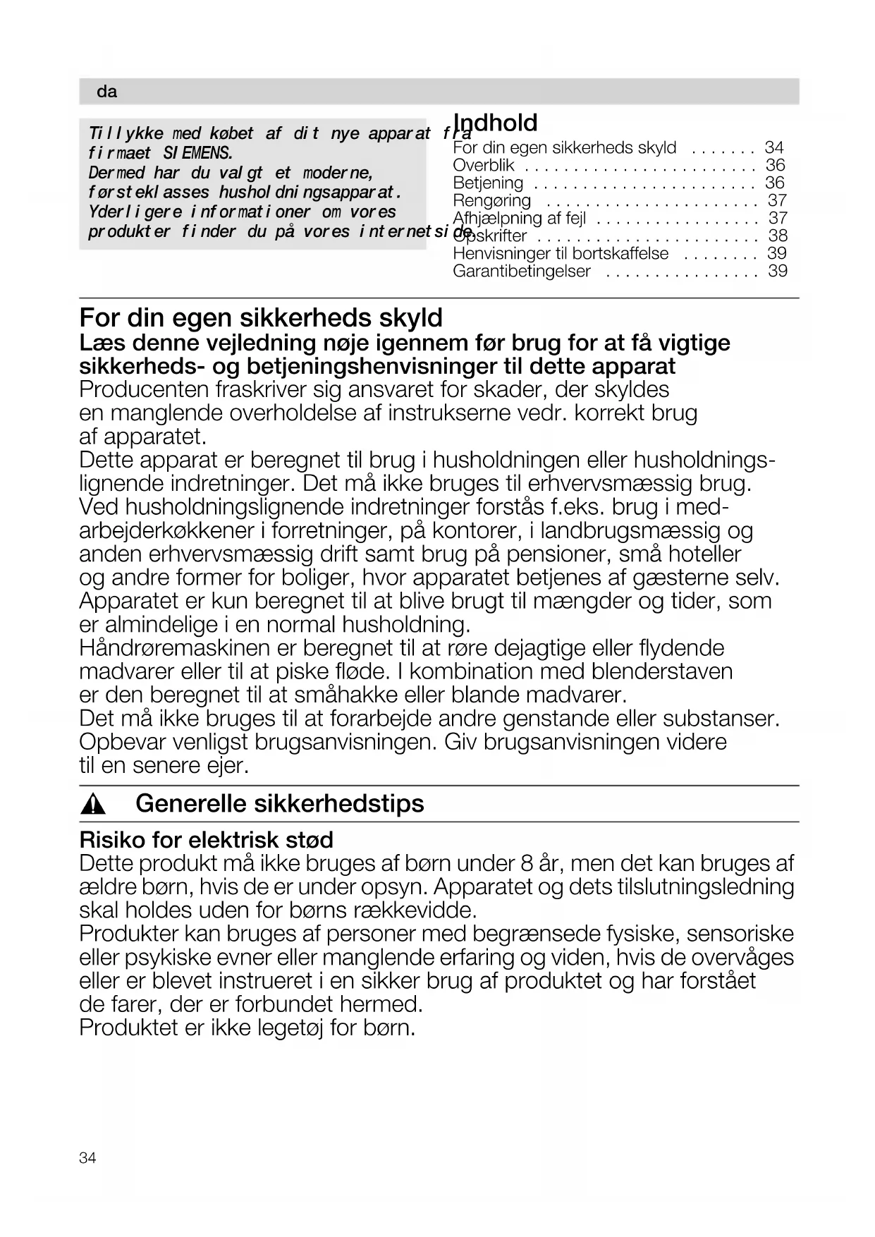 - Garantibetingelser For din egen sikkerheds skyld Læs denne vejledning nøje igennem før brug for at få vigtige sikkerheds- og betjeningshenvisninger til dette apparat Producenten fraskriver sig ansvaret for skader, der skyldes en manglende overholdelse af instrukserne vedr. korrekt brug af apparatet. Dette apparat er beregnet til brug i husholdningen eller husholdnings- lignende indretninger. Det må ikke bruges til erhvervsmæssig brug. Ved husholdningslignende indretninger forstås f.eks. brug i med- arbejderkøkkener i forretninger, på kontorer, i landbrugsmæssig og anden erhvervsmæssig drift samt brug på pensioner, små hoteller og andre former for boliger, hvor apparatet betjenes af gæsterne selv. Apparatet er kun beregnet til at blive brugt til mængder og tider, som er almindelige i en normal husholdning. Håndrøremaskinen er beregnet til at røre dejagtige eller flydende madvarer eller til at piske fløde. I kombination med blenderstaven er den beregnet til at småhakke eller blande madvarer. Det må ikke bruges til at forarbejde andre genstande eller substanser. Opbevar venligst brugsanvisningen. Giv brugsanvisningen videre til en senere ejer. , Generelle sikkerhedstips Risiko for elektrisk stød Dette produkt må ikke bruges af børn under 8 år, men det kan bruges af ældre børn, hvis de er under opsyn. Apparatet og dets tilslutningsledning skal holdes uden for børns rækkevidde. Produkter kan bruges af personer med begrænsede fysiske, sensoriske eller psykiske evner eller manglende erfaring og viden, hvis de overvåges eller er blevet instrueret i en sikker brug af produktet og har forstået de farer, der er forbundet hermed. Produktet er ikke legetøj for børn. p. 39
