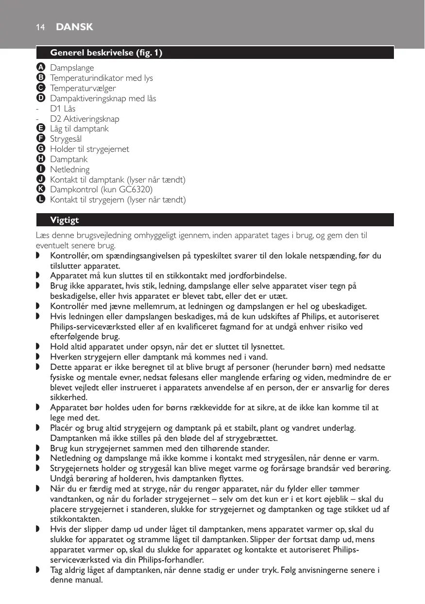 Dampslange Temperaturindikator med lys Temperaturvælger Dampaktiveringsknap med lås D1 Lås D2 Aktiveringsknap Låg til damptank Strygesål Holder til strygejernet Damptank Netledning Kontakt til damptank (lyser når tændt) Dampkontrol (kun GC6320) Kontakt til strygejern (lyser når tændt) Vigtigt Læs denne brugsvejledning omhyggeligt igennem, inden apparatet tages i brug, og gem den til eventuelt senere brug. , Kontrollér, om spændingsangivelsen på typeskiltet svarer til den lokale netspænding, før du tilslutter apparatet. , Apparatet må kun sluttes til en stikkontakt med jordforbindelse. , Brug ikke apparatet, hvis stik, ledning, dampslange eller selve apparatet viser tegn på beskadigelse, eller hvis apparatet er blevet tabt, eller det er utæt. , Kontrollér med jævne mellemrum, at ledningen og dampslangen er hel og ubeskadiget. , Hvis ledningen eller dampslangen beskadiges, må de kun udskiftes af Philips, et autoriseret Philips-serviceværksted eller af en kvalificeret fagmand for at undgå enhver risiko ved efterfølgende brug. , Hold altid apparatet under opsyn, når det er sluttet til lysnettet. , Hverken strygejern eller damptank må kommes ned i vand. , Dette apparat er ikke beregnet til at blive brugt af personer (herunder børn) med nedsatte fysiske og mentale evner, nedsat følesans eller manglende erfaring og viden, medmindre de er blevet vejledt eller instrueret i apparatets anvendelse af en person, der er ansvarlig for deres sikkerhed. , Apparatet bør holdes uden for børns rækkevidde for at sikre, at de ikke kan komme til at lege med det. , Placér og brug altid strygejern og damptank på et stabilt, plant og vandret underlag. Damptanken må ikke stilles på den bløde del af strygebrættet. , Brug kun strygejernet sammen med den tilhørende stander. , Netledning og dampslange må ikke komme i kontakt med strygesålen, når denne er varm. , Strygejernets holder og strygesål kan blive meget varme og forårsage brandsår ved berøring. Undgå berøring af holderen, hvis damptanken flyttes. , Når du er færdig med at stryge, når du rengør apparatet, når du fylder eller tømmer vandtanken, og når du forlader strygejernet – selv om det kun er i et kort øjeblik – skal du placere strygejernet i standeren, slukke for strygejernet og damptanken og tage stikket ud af stikkontakten. , Hvis der slipper damp ud under låget til damptanken, mens apparatet varmer op, skal du slukke for apparatet og stramme låget til damptanken. Slipper der fortsat damp ud, mens apparatet varmer op, skal du slukke for apparatet og kontakte et autoriseret Philipsserviceværksted via din Philips-forhandler. , Tag aldrig låget af damptanken, når denne stadig er under tryk. Følg anvisningerne senere i denne manual. Dansk 15