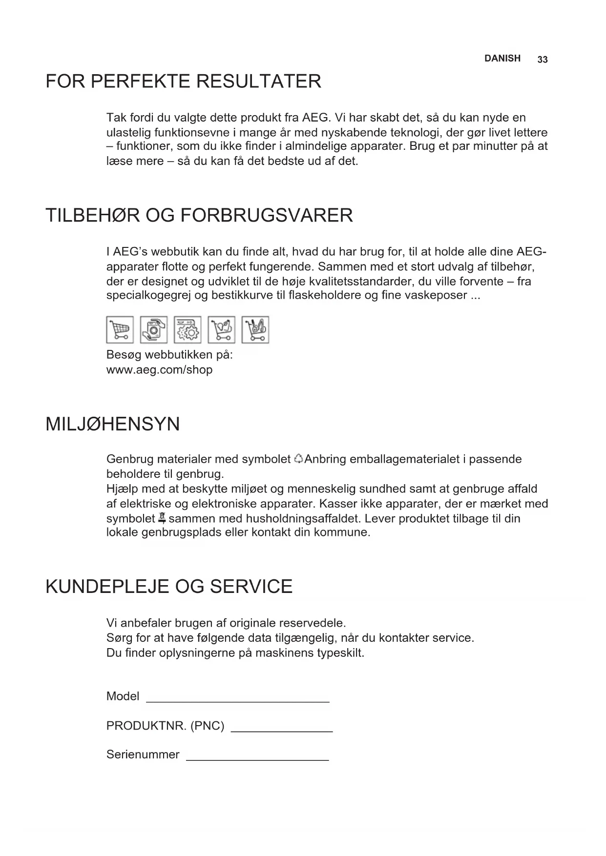 I AEG’s webbutik kan du nde alt, hvad du har brug for, til at holde alle dine AEG- apparater otte og perfekt fungerende. Sammen med et stort udvalg af tilbehør, der er designet og udviklet til de høje kvalitetsstandarder, du ville forvente – fra specialkogegrej og bestikkurve til askeholdere og ne vaskeposer ... Besøg webbutikken på: www.aeg.com/shop MILJØHENSYN Genbrug materialer med symbolet . Anbring emballagematerialet i passende beholdere til genbrug. Hjælp med at beskytte miljøet og menneskelig sundhed samt at genbruge affald af elektriske og elektroniske apparater. Kasser ikke apparater, der er mærket med symbolet , sammen med husholdningsaffaldet. Lever produktet tilbage til din lokale genbrugsplads eller kontakt din kommune.