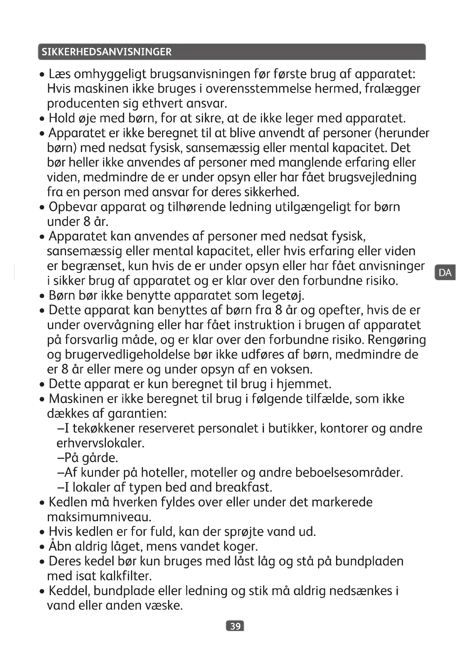 Selvlettebrandskaderkanhavemegetalvorligekonsekvenserforbørn. Lærbarnetatpassepåvarmevæskerikøkkenetefterhånden,somdetvokserop.Sørgforat anbringeelkedlenogledningenindmodvæggen–vækfrakøkkenbordetskantogudenforbørns rækkevidde. Hvis der skulle ske en ulykke,skalhudenøjeblikkeligtafkølesmedkoldtvand.Søgeventueltlæge.