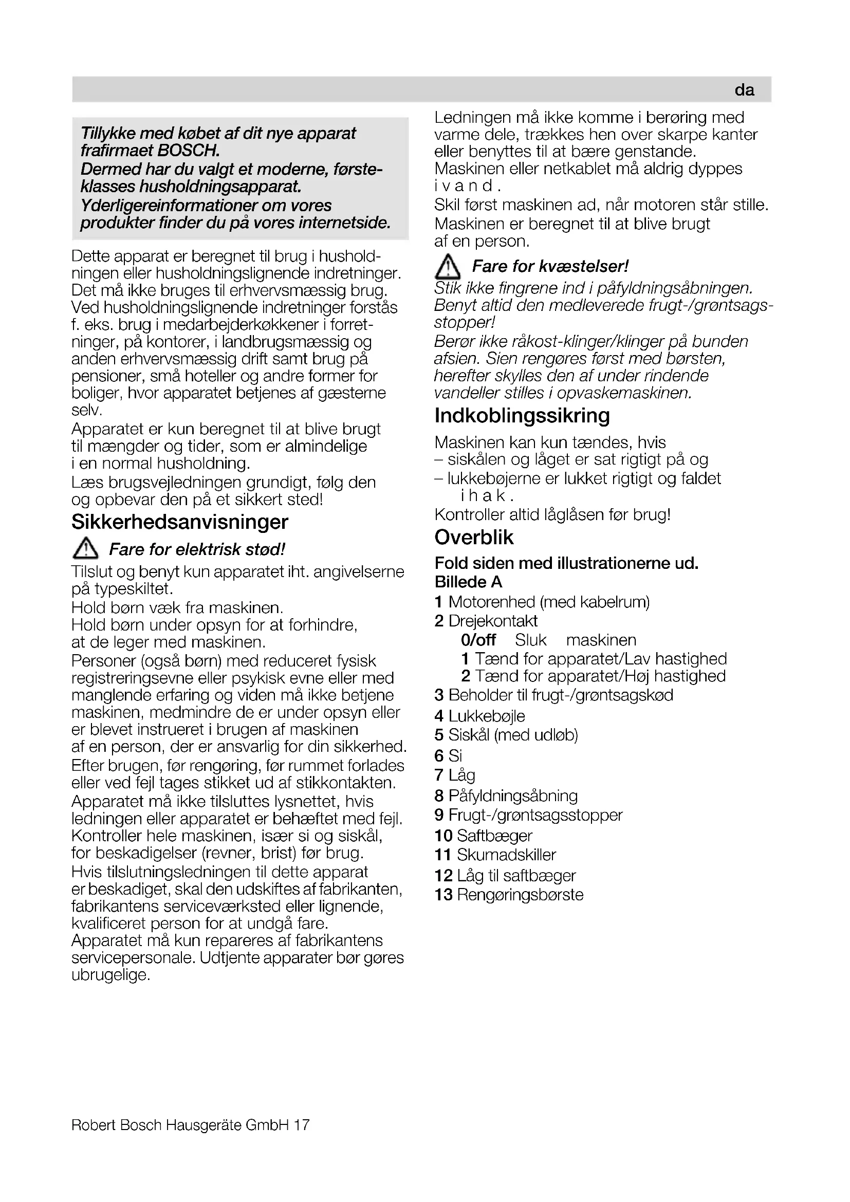 Wijzigingen voorbehouden.Robert Bosch Hausgeräte GmbH 17 Dette apparat er beregnet til brug i hushold- ningen eller husholdningslignende indretninger. Det må ikke bruges til erhvervsmæssig brug. Ved husholdningslignende indretninger forstås f. eks. brug i medarbejderkøkkener i forret- ninger, på kontorer, i landbrugsmæssig og anden erhvervsmæssig drift samt brug på pensioner, små hoteller og andre former for boliger, hvor apparatet betjenes af gæsterne selv. Apparatet er kun beregnet til at blive brugt til mængder og tider, som er almindelige i en normal husholdning. Læs brugsvejledningen grundigt, følg den og opbevar den på et sikkert sted! Sikkerhedsanvisninger c~êÉ=Ñçê=ÉäÉâíêáëâ=ëí›Ç> Tilslut og benyt kun apparatet iht. angivelserne på typeskiltet. Hold børn væk fra maskinen. Hold børn under opsyn for at forhindre, at de leger med maskinen. Personer (også børn) med reduceret fysisk registreringsevne eller psykisk evne eller med manglende erfaring og viden må ikke betjene maskinen, medmindre de er under opsyn eller er blevet instrueret i brugen af maskinen af en person, der er ansvarlig for din sikkerhed. Efter brugen, før rengøring, før rummet forlades eller ved fejl tages stikket ud af stikkontakten. Apparatet må ikke tilsluttes lysnettet, hvis ledningen eller apparatet er behæftet med fejl. Kontroller hele maskinen, især si og siskål, for beskadigelser (revner, brist) før brug. Hvis tilslutningsledningen til dette apparat er beskadiget, skal den udskiftes af fabrikanten, fabrikantens serviceværksted eller lignende, kvalificeret person for at undgå fare. Apparatet må kun repareres af fabrikantens servicepersonale. Udtjente apparater bør gøres ubrugelige. Ledningen må ikke komme i berøring med varme dele, trækkes hen over skarpe kanter eller benyttes til at bære genstande. Maskinen eller netkablet må aldrig dyppes ivand. Skil først maskinen ad, når motoren står stille. Maskinen er beregnet til at blive brugt af en person. c~êÉ=Ñçê=âî‹ëíÉäëÉê> píáâ=áââÉ=ÑáåÖêÉåÉ=áåÇ=á=é™ÑóäÇåáåÖë™ÄåáåÖÉåK= _Éåóí=~äíáÇ=ÇÉå=ãÉÇäÉîÉêÉÇÉ=ÑêìÖíJLÖê›åíë~ÖëJ ëíçééÉê> _Éê›ê=áââÉ=ê™âçëíJâäáåÖÉêLâäáåÖÉê=é™=ÄìåÇÉå= ~Ñ ëáÉåK=páÉå=êÉåÖ›êÉë=Ñ›êëí=ãÉÇ=Ä›êëíÉåI= ÜÉêÉÑíÉê=ëâóääÉë=ÇÉå=~Ñ=ìåÇÉê=êáåÇÉåÇÉ= î~åÇ ÉääÉê=ëíáääÉë=á=çéî~ëâÉã~ëâáåÉåK Indkoblingssikring Maskinen kan kun tændes, hvis – siskålen og låget er sat rigtigt på og – lukkebøjerne er lukket rigtigt og faldet ihak. Kontroller altid låglåsen før brug! Overblik Fold siden med illustrationerne ud. Billede A 1 Motorenhed (med kabelrum) 2 Drejekontakt 0/off Sluk maskinen 1 Tænd for apparatet/Lav hastighed 2 Tænd for apparatet/Høj hastighed 3 Beholder til frugt-/grøntsagskød 4 Lukkebøjle 5 Siskål (med udløb) 6 Si 7 Låg 8 Påfyldningsåbning 9 Frugt-/grøntsagsstopper 10 Saftbæger 11 Skumadskiller 12 Låg til saftbæger 13 Rengøringsbørste