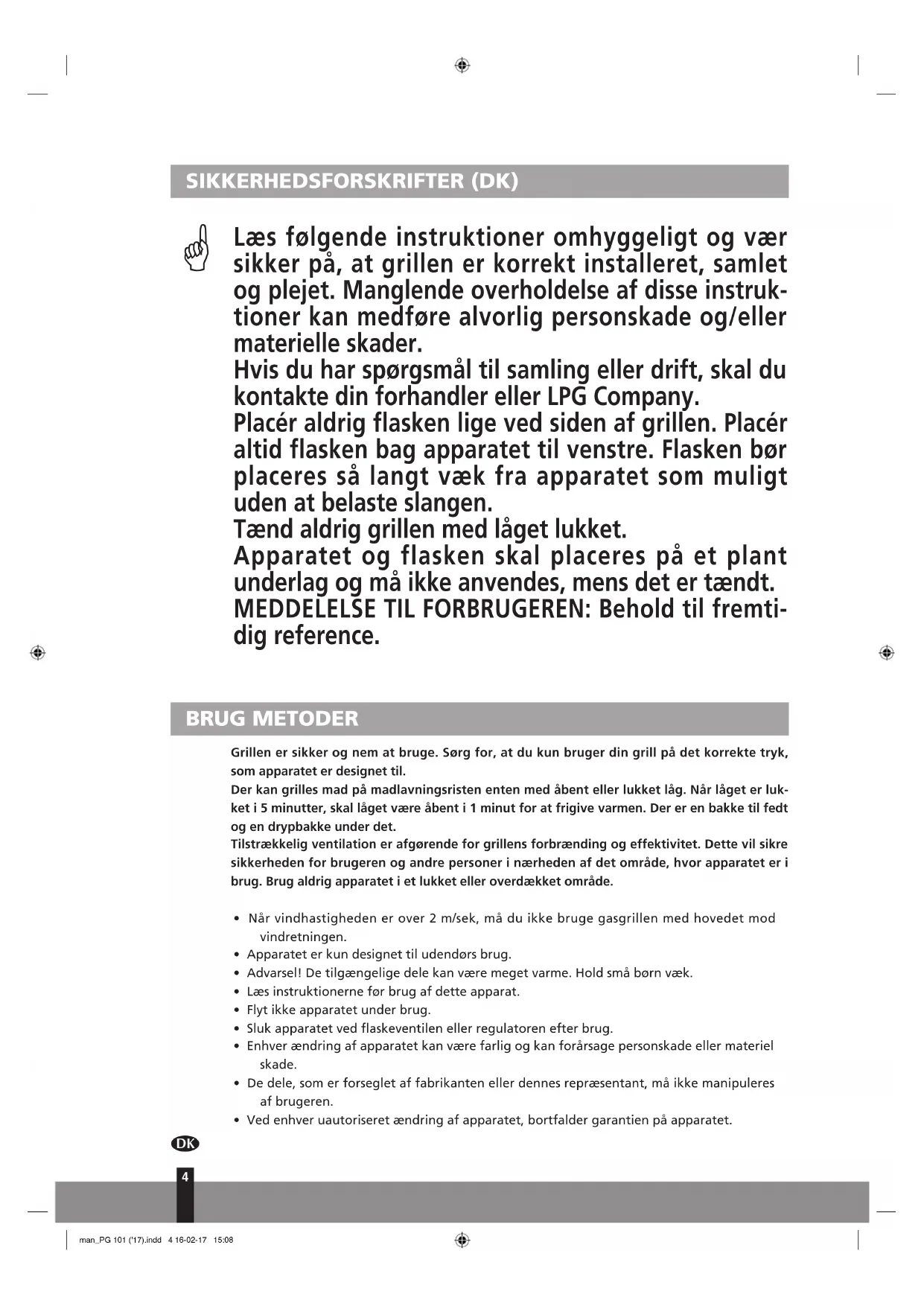 - Når vindhastigheden er over 2 m/sek, må du ikke bruge gasgrillen med hovedet mod vindretningen.• Apparatet er kun designet til udendørs brug.• Advarsel! De tilgængelige dele kan være meget varme. Hold små børn væk.• Læs instruktionerne før brug af dette apparat.• Flyt ikke apparatet under brug.• Sluk apparatet ved flaskeventilen eller regulatoren efter brug.• Enhver ændring af apparatet kan være farlig og kan forårsage personskade eller materiel skade.• De dele, som er forseglet af fabrikanten eller dennes repræsentant, må ikke manipuleres af brugeren.• Ved enhver uautoriseret ændring af apparatet, bortfalder garantien på apparatet. man_PG 101 ('17).indd 4 16-02-17 15:085