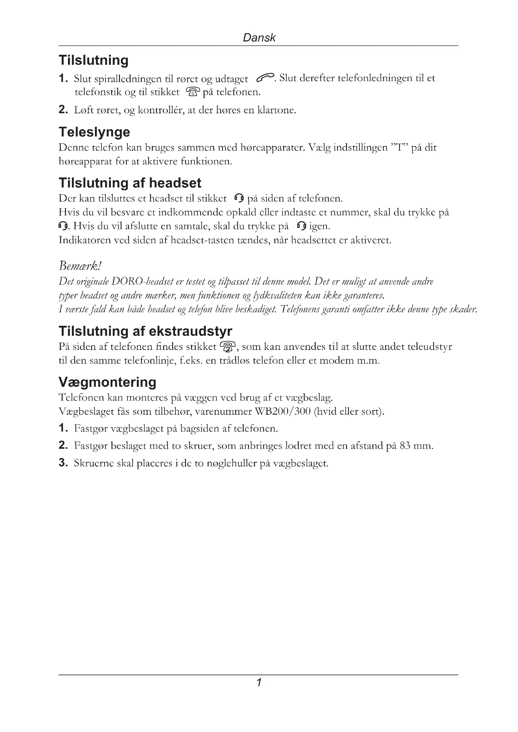 igen. Indikatoren ved siden af headset-tasten tændes, når headsettet er aktiveret. Bemærk! Det originale DORO-headset er testet og tilpasset til denne model. Det er muligt at anvende andre typer headset og andre mærker, men funktionen og lydkvaliteten kan ikke garanteres. I værste fald kan både headset og telefon blive beskadiget. Telefonens garanti omfatter ikke denne type skader. Tilslutning af ekstraudstyr På siden af telefonen ndes stikket 8, som kan anvendes til at slutte andet teleudstyr til den samme telefonlinje, f.eks. en trådløs telefon eller et modem m.m. Vægmontering Telefonen kan monteres på væggen ved brug af et vægbeslag. Vægbeslaget fås som tilbehør, varenummer WB200/300 (hvid eller sort).