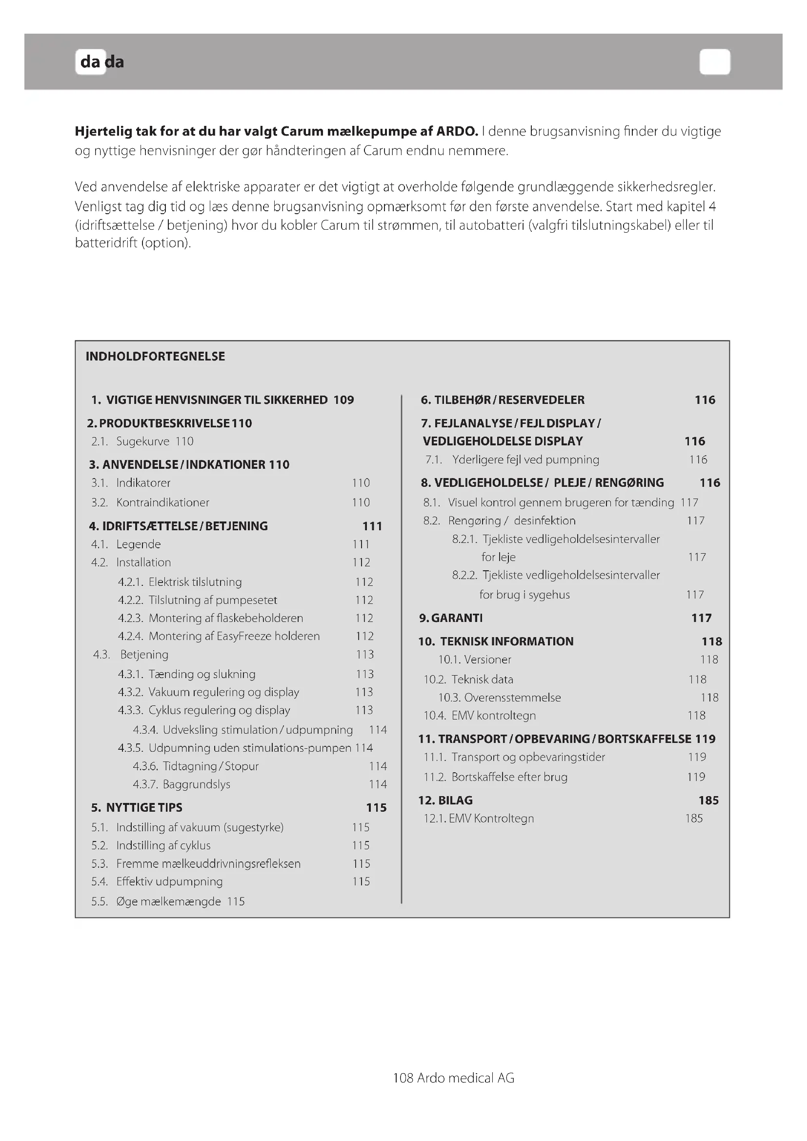 i.da da 108 Ardo medical AG Hjertelig tak for at du har valgt Carum mælkepumpe af ARDO. I denne brugsanvisning finder du vigtige og nyttige henvisninger der gør håndteringen af Carum endnu nemmere. Ved anvendelse af elektriske apparater er det vigtigt at overholde følgende grundlæggende sikkerhedsregler. Venligst tag dig tid og læs denne brugsanvisning opmærksomt før den første anvendelse. Start med kapitel 4 (idriftsættelse/betjening)hvordukoblerCarumtilstrømmen,tilautobatteri(valgfritilslutningskabel)ellertil batteridrift (option). INDHOLDFORTEGNELSE