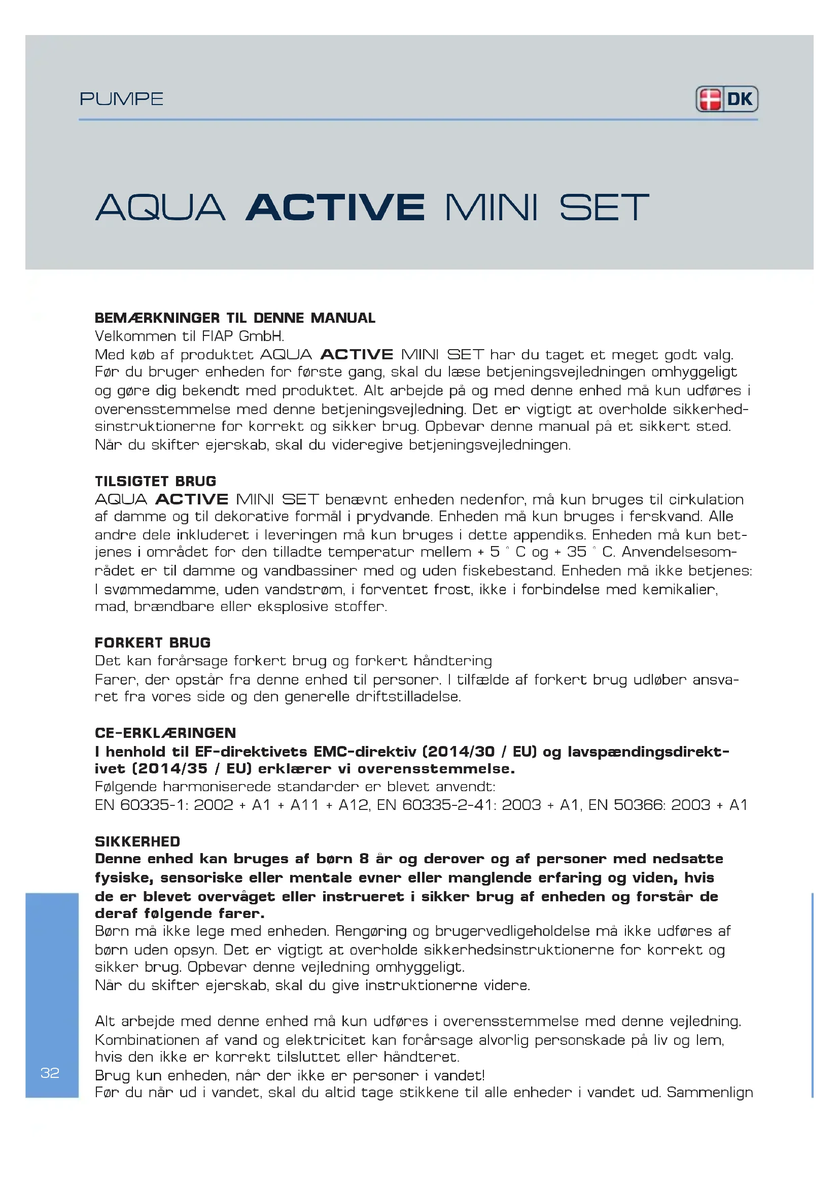 Med køb af produktet AQUA ACTIVE MINI SET har du taget et meget godt valg. Før du bruger enheden for første gang, skal du læse betjeningsvejledningen omhyggeligt og gøre dig bekendt med produktet. Alt arbejde på og med denne enhed må kun udføres i overensstemmelse med denne betjeningsvejledning. Det er vigtigt at overholde sikkerhedsinstruktionerne for korrekt og sikker brug. Opbevar denne manual på et sikkert sted. Når du skifter ejerskab, skal du videregive betjeningsvejledningen.