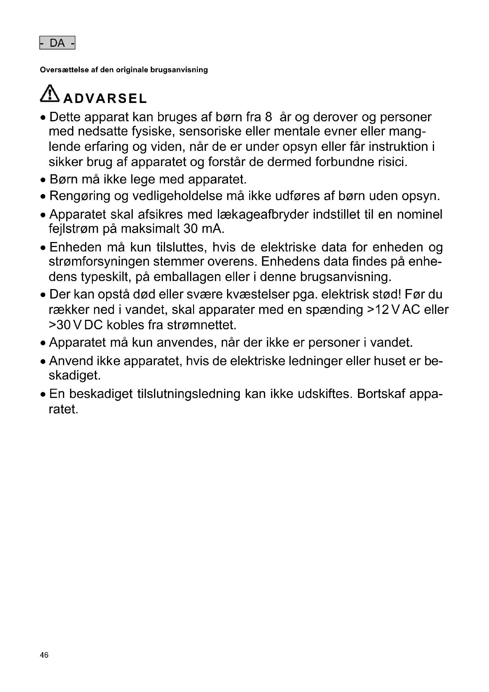 - Der kan opstå død eller svære kvæstelser pga. elektrisk stød! Før du rækker ned i vandet, skal apparater med en spænding >12 V AC eller >30 V DC kobles fra strømnettet.