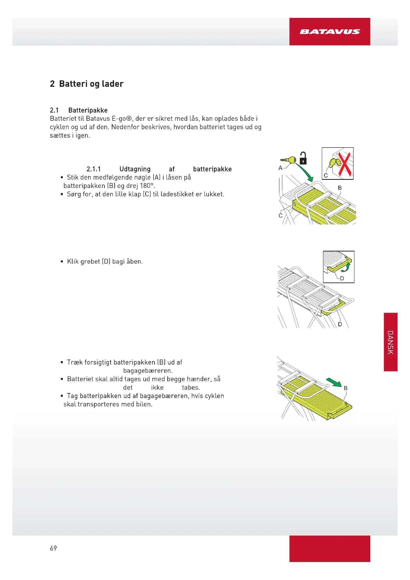 Batteriet til Batavus E-go®, der er sikret med lås, kan oplades både i cyklen og ud af den. Nedenfor beskrives, hvordan batteriet tages ud og sættes iigen.
