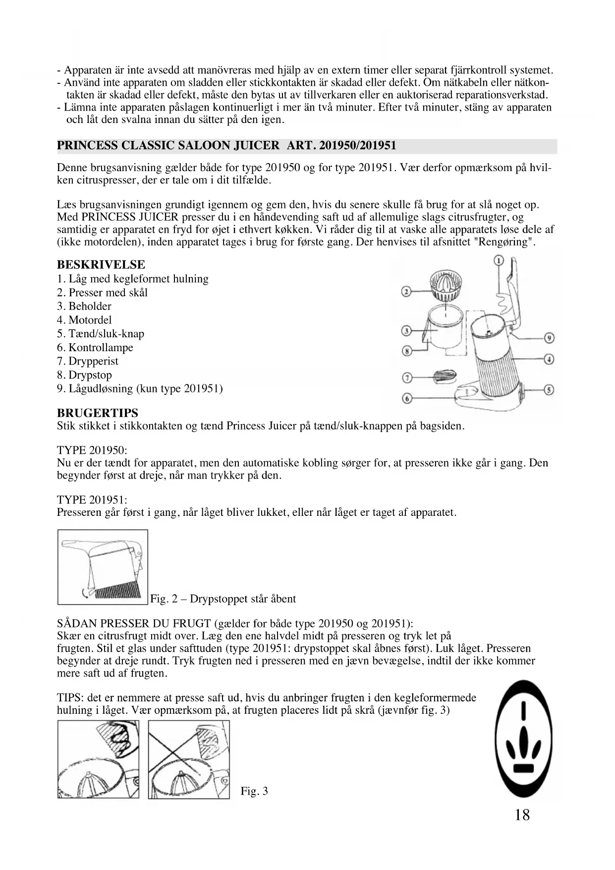 BRUGERTIPS Stik stikket i stikkontakten og tænd Princess Juicer på tænd/sluk-knappen på bagsiden. TYPE 201950: Nu er der tændt for apparatet, men den automatiske kobling sørger for, at presseren ikke går i gang. Den begynder først at dreje, når man trykker på den. TYPE 201951: Presseren går først i gang, når låget bliver lukket, eller når låget er taget af apparatet. Fig. 2 – Drypstoppet står åbent SÅDAN PRESSER DU FRUGT (gælder for både type 201950 og 201951): Skær en citrusfrugt midt over. Læg den ene halvdel midt på presseren og tryk let på frugten. Stil et glas under safttuden (type 201951: drypstoppet skal åbnes først). Luk låget. Presseren begynder at dreje rundt. Tryk frugten ned i presseren med en jævn bevægelse, indtil der ikke kommer mere saft ud af frugten. TIPS: det er nemmere at presse saft ud, hvis du anbringer frugten i den kegleformermede hulning i låget. Vær opmærksom på, at frugten placeres lidt på skrå (jævnfør fig. 3) Fig. 319 Tryk ikke for hårdt. Hvis man hører, at motoren begynder at dreje langsommere rundt, er trykket for stort. Dette vil dog aldrig resultere i en defekt motor, da motoren er forsynet med en termisk sikring, som slukker den ved overophedning. I den slags tilfælde er det bedst at slukke på tænd/sluk-knappen. Efter få minutter er motoren tilstrækkeligt afkølet, og kan Princess Juicer atter tages i brug. Sluk på tænd/sluk-knappen, hver eneste gang apparatet har været i brug. I nogle tilfælde er det nemmere at trykke frugten ned på presseren med hånden i stedet for med låget. Denne fremgangsmåde tilrådes, hvis de halve frugter ikke passer i den kegleformede hulning, som f. eks. små appelsiner eller citroner eller store grapefrugter. På type 201950 trykker du ganske enkelt de halve frugter ned over presseren med hånden. På type 201951: Før du trykker, skal låget fjernes fra motordelen først. For at fjerne låget, trykke låget release (se fig. 4) knap på bagsiden af den lukkede låget og derefter trække låget op. Motoren vil nu vende kontinu- erligt. Fig. 4 Låget sættes på igen i omvendt rækkefølge. RENGØRING TAG ALTID FØRST STIKKET UD AF STIKKONTAKTEN Rengør juicer efter hver brug for at forhindre sidesten frugt fra stikning. Den saftfremstilling kegle med pulp rum, reservoiret og dryp rack kan let fjernes ved at trække dem op. Må ikke vaskes disse i opvaske- maskinen. Disse komponenter kan vaskes i varmt sæbevand. Brug ikke slibende eller stærke rengørings- midler. Tør låget med pressemøde med en fugtig klud. Tør motordelen med en fugtig klud. KOM ALDRIG MOTORDELEN NED I VAND ELLER ANDRE VÆSKER. PRINCESS TIPS - Anvend kun juiceren til husholdningsbrug. - Sørg for, at juicerens ledning eller en eventuel forlængerledning anbringes således, at ingen kan falde over den. - Hvis juiceren eller ledningen beskadiges, bør du undgå al anvendelse og sende apparatet til reparation imforretningen. En defekt ledning bør udelukkende udskiftes af vores tekniske afdeling. - Anvend aldrig juiceren udendørs. - Vær ekstra forsigtig med brug af juiceren, når der er børn i nærheden. - Sluk for apparatet, og tag fra strømforsyningen, før udskiftning af tilbehør, eller nærmer dele, der bevæger sig i brug. - Apparatet er egnet til indendørs brug. Apparatet er egnet til brug i hjemmet. - Dette apparat er ikke beregnet til brug af personer (herunder børn) med reducerede fysiske, sensoriske eller mentale evner, eller manglende erfaring og viden, medmindre de er blevet vejledt eller instrueret i brugen af apparatet af en person, der er ansvarlig for deres sikkerhed . - Børn skal være under opsyn for at sikre, at de ikke leger med apparatet. - Apparatet er ikke beregnet til at blive betjent ved hjælp af en ekstern timer eller separate fjernbetjening system. - Brug ikke apparatet, hvis netledningen eller stikket er beskadiget eller defekt. Hvis net- kablet eller netstikket er beskadiget eller defekt, skal den udskiftes af producenten eller en autoriseret reparatør. - Efterlad ikke apparatet tændt uafbrudt i mere end to minutter. Efter to minutter, skal du slukke for apparatet og lad det køle ned, før du tænder den igen.20