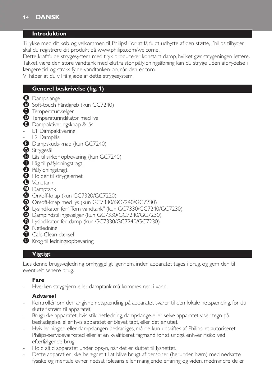 Dampslange Soft-touch håndgreb (kun GC7240) Temperaturvælger Temperaturindikator med lys Dampaktiveringsknap & lås E1 Dampaktivering E2 Damplås Dampskuds-knap (kun GC7240) Strygesål Lås til sikker opbevaring (kun GC7240) Låg til påfyldningstragt Påfyldningstragt Holder til strygejernet Vandtank Damptank On/off-knap (kun GC7320/GC7220) On/off-knap med lys (kun GC7330/GC7240/GC7230) Lysindikator for “Tom vandtank” (kun GC7330/GC7240/GC7230) Dampindstillingsvælger (kun GC7330/GC7240/GC7230) Lysindikator for damp (kun GC7330/GC7240/GC7230) Netledning Calc-Clean dæksel Krog til ledningsopbevaring Vigtigt Læs denne brugsvejledning omhyggeligt igennem, inden apparatet tages i brug, og gem den til eventuelt senere brug.