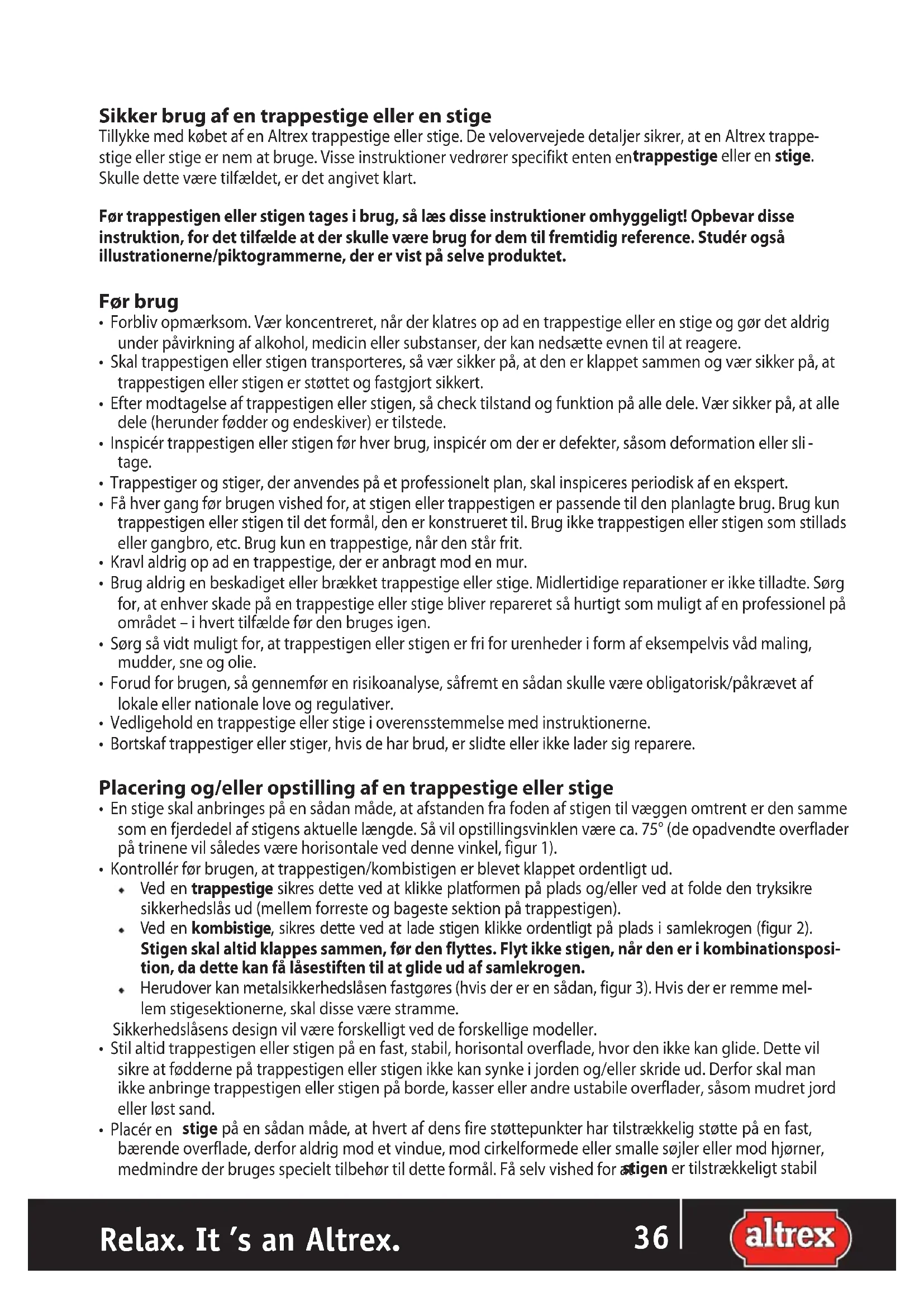 Relax. It ’s an Altrex. NOSikker brug af en trappestige eller en stige Tillykke med købet af en Altrex trappestige eller stige. De velovervejede detaljer sikrer, at en Altrex trappe- stige eller stige er nem at bruge. Visse instruktioner vedrører specifikt enten en trappestige eller en stige. Skulle dette være tilfældet, er det angivet klart. Før trappestigen eller stigen tages i brug, så læs disse instruktioner omhyggeligt! Opbevar disse instruktion, for det tilfælde at der skulle være brug for dem til fremtidig reference. Studér også illustrationerne/piktogrammerne, der er vist på selve produktet. Før brug