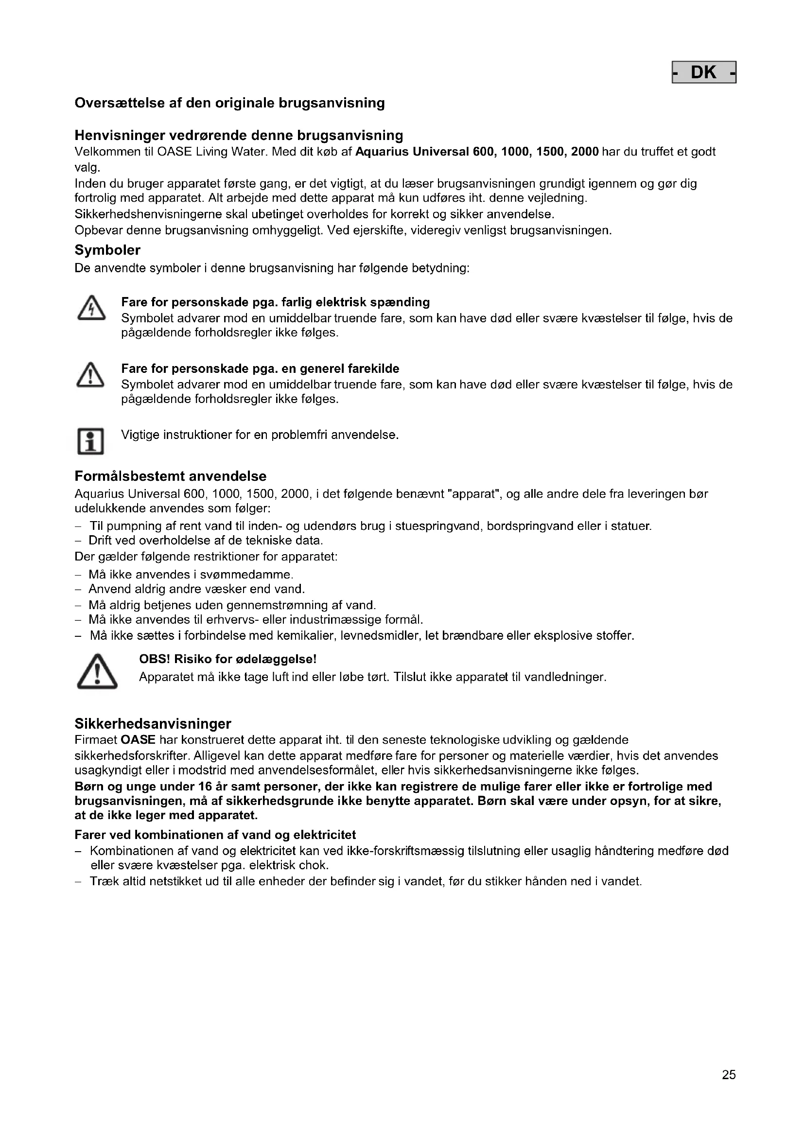 Conservare l'apparecchio immerso nell'acqua o riempito d'acqua e al riparo dal gelo. Non sommergere la spina! Riparazione Una scatola danneggiata non può essere riparata e quindi non può essere impiegata. Smaltire l’apparecchio a regola d’arte.25 - DK - Oversættelse af den originale brugsanvisning Henvisninger vedrørende denne brugsanvisning Velkommen til OASE Living Water. Med dit køb af Aquarius Universal 600, 1000, 1500, 2000 har du truffet et godt valg. Inden du bruger apparatet første gang, er det vigtigt, at du læser brugsanvisningen grundigt igennem og gør dig fortrolig med apparatet. Alt arbejde med dette apparat må kun udføres iht. denne vejledning. Sikkerhedshenvisningerne skal ubetinget overholdes for korrekt og sikker anvendelse. Opbevar denne brugsanvisning omhyggeligt. Ved ejerskifte, videregiv venligst brugsanvisningen. Symboler De anvendte symboler i denne brugsanvisning har følgende betydning: