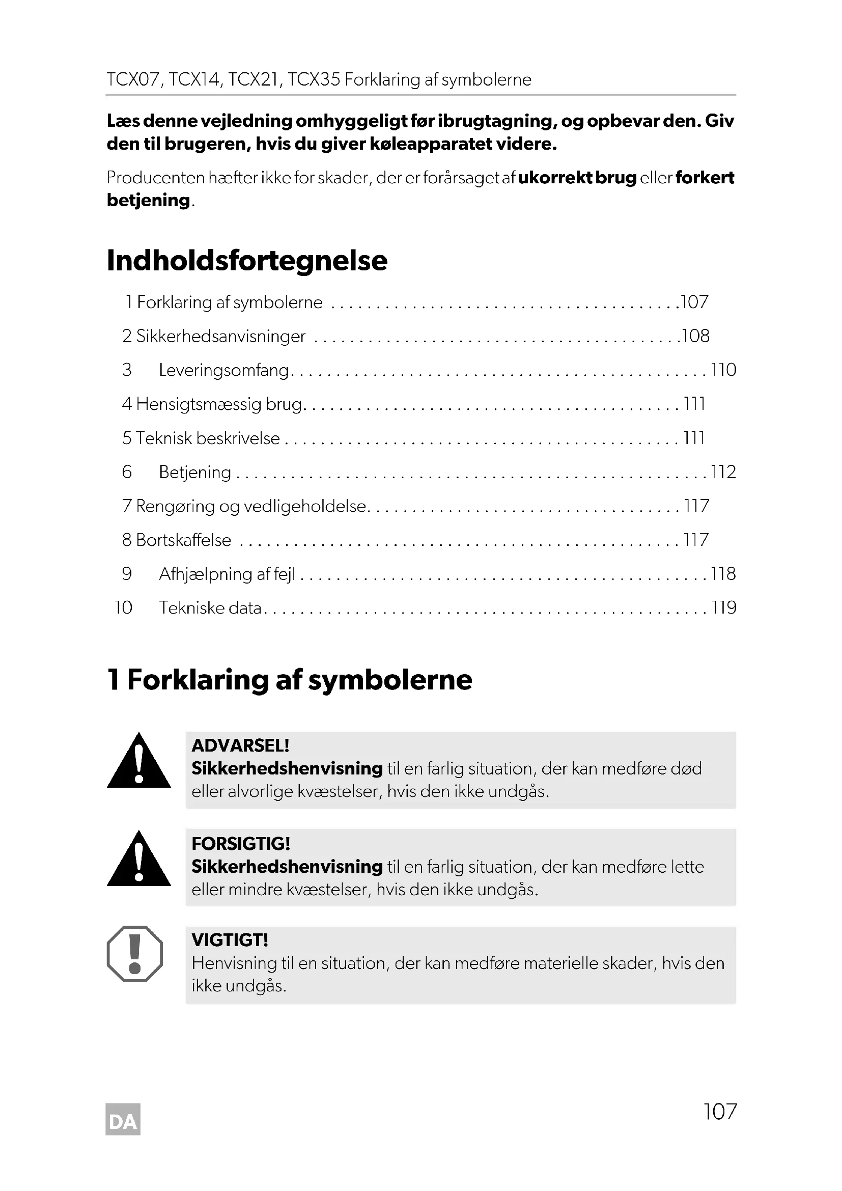 ADVARSEL! Sikkerhedshenvisning til en farlig situation, der kan medføre død eller alvorlige kvæstelser, hvis den ikke undgås. FORSIGTIG! Sikkerhedshenvisning til en farlig situation, der kan medføre lette eller mindre kvæstelser, hvis den ikke undgås. VIGTIGT! Henvisning til en situation, der kan medføre materielle skader, hvis den ikke undgås. TCX07-TCX35-OPM-EMEA16.book Seite 107 Donnerstag, 11. Juli 2019 12:20 12DA Sikkerhedsanvisninger TCX07, TCX14, TCX21, TCX35