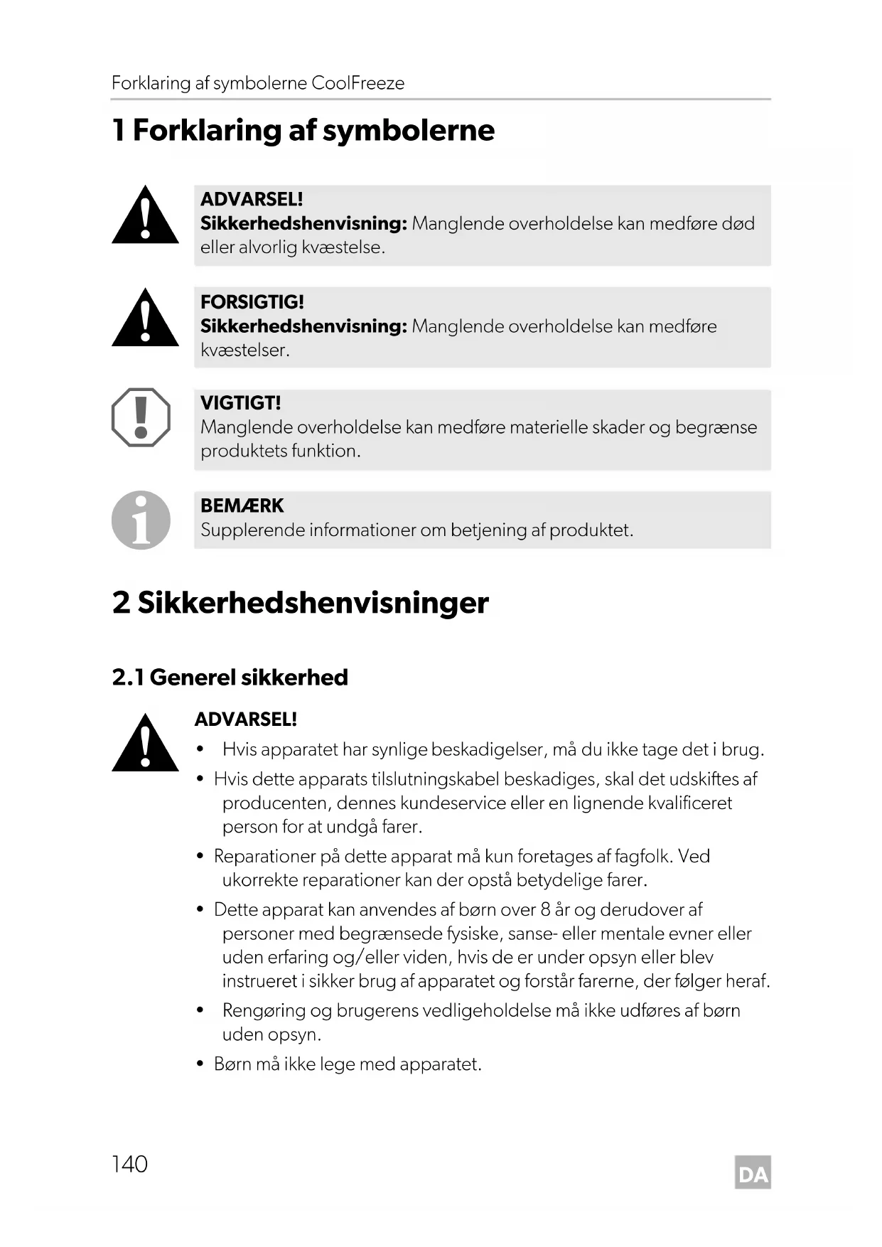 - Børn må ikke lege med apparatet. ADVARSEL! Sikkerhedshenvisning: Manglende overholdelse kan medføre død eller alvorlig kvæstelse. FORSIGTIG! Sikkerhedshenvisning: Manglende overholdelse kan medføre kvæstelser. VIGTIGT! Manglende overholdelse kan medføre materielle skader og begrænse produktets funktion. BEMÆRK Supplerende informationer om betjening af produktet. CDF18-26-36-46--O-16s.book Seite 140 Montag, 7. November 2016 2:13 14DA CoolFreeze Sikkerhedshenvisninger