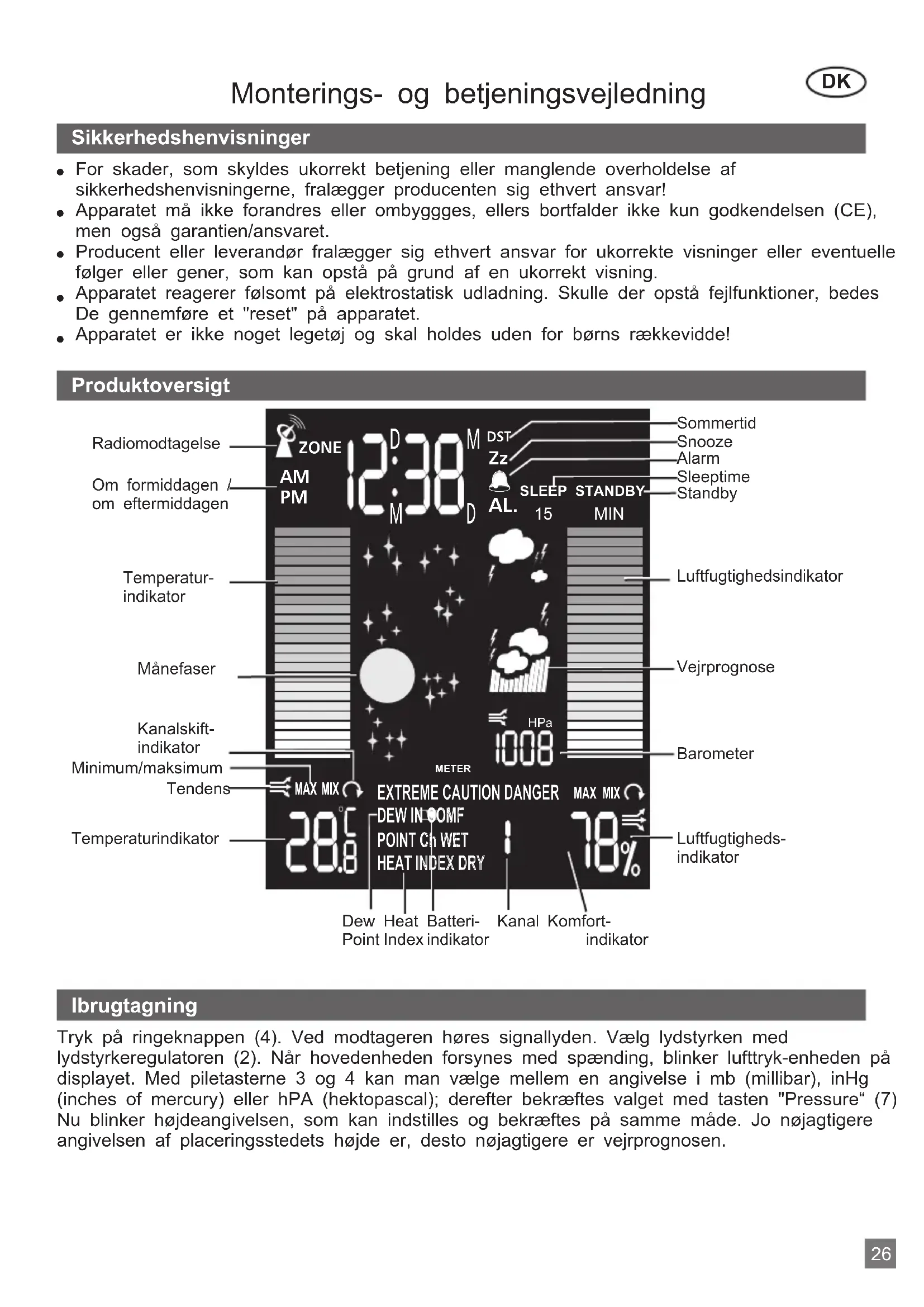 For skader, som skyldes ukorrekt betjening eller manglende overholdelse afsikkerhedshenvisningerne, fralægger producenten sig ethvert ansvar!Apparatet må ikke forandres eller ombyggges, ellers bortfalder ikke kun godkendelsen (CE),men også garantien/ansvaret.Producent eller leverandør fralægger sig ethvert ansvar for ukorrekte visninger eller eventuellefølger eller gener, som kan opstå på grund af en ukorrekt visning.Apparatet reagerer følsomt på elektrostatisk udladning. Skulle der opstå fejlfunktioner, bedesDe gennemføre et "reset" på apparatet.Apparatet er ikke noget legetøj og skal holdes uden for børns rækkevidde!