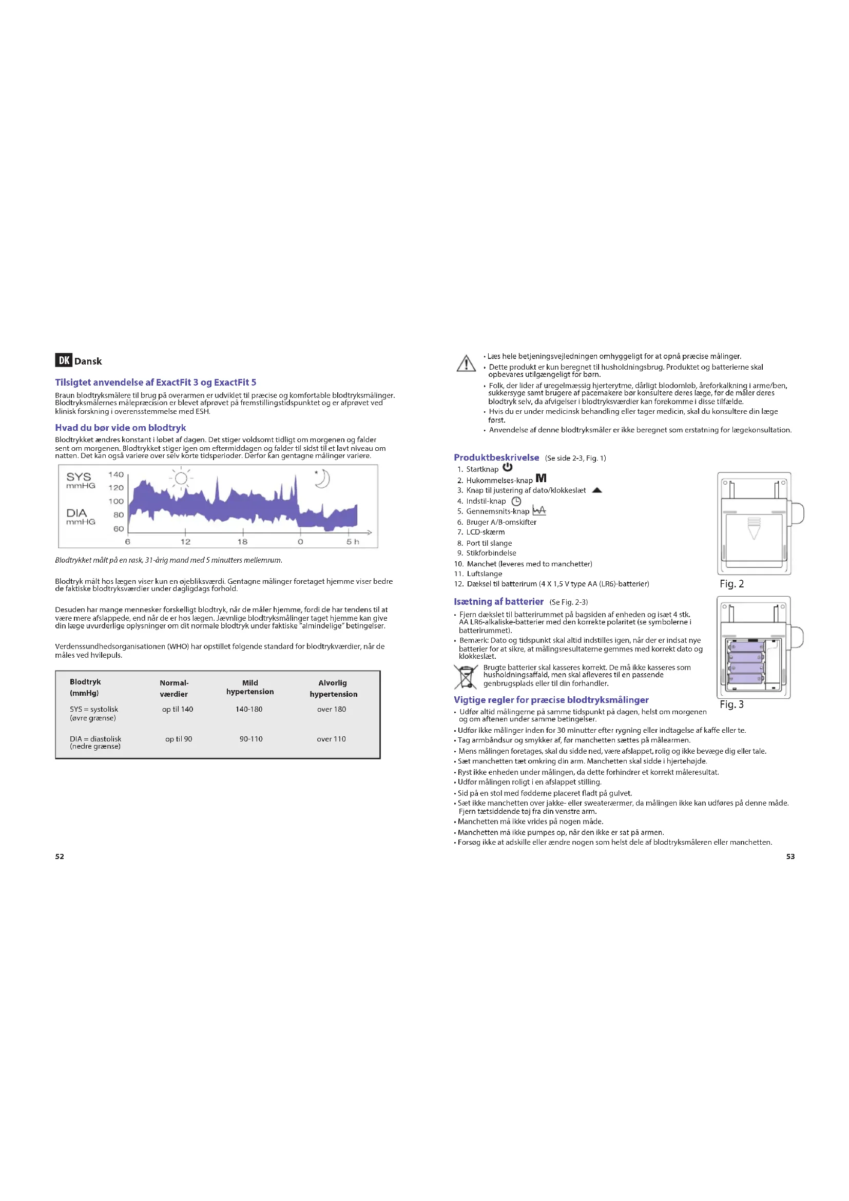 Dansk Tilsigtet anvendelse af ExactFit 3 og ExactFit 5 Braun blodtryksmålere til brug på overarmen er udviklet til præcise og komfortable blodtryksmålinger. Blodtryksmålernes målepræcision er blevet afprøvet på fremstillingstidspunktet og er afprøvet ved klinisk forskning i overensstemmelse med ESH. Hvad du bør vide om blodtryk Blodtrykket ændres konstant i løbet af dagen. Det stiger voldsomt tidligt om morgenen og falder sent om morgenen. Blodtrykket stiger igen om eftermiddagen og falder til sidst til et lavt niveau om natten. Det kan også variere over selv korte tidsperioder. Derfor kan gentagne målinger variere. Blodtrykket målt på en rask, 31-årig mand med 5 minutters mellemrum. Blodtryk målt hos lægen viser kun en øjebliksværdi. Gentagne målinger foretaget hjemme viser bedre de faktiske blodtryksværdier under dagligdags forhold. Desuden har mange mennesker forskelligt blodtryk, når de måler hjemme, fordi de har tendens til at være mere afslappede, end når de er hos lægen. Jævnlige blodtryksmålinger taget hjemme kan give din læge uvurderlige oplysninger om dit normale blodtryk under faktiske ”almindelige” betingelser. Verdenssundhedsorganisationen (WHO) har opstillet følgende standard for blodtrykværdier, når de måles ved hvilepuls. Blodtryk (mmHg) Normal- værdier Mild hypertension Alvorlig hypertension SYS = systolisk op til 140 140-180 over 180 (øvre grænse) DIA = diastolisk op til 90 90-110 over 110 (nedre grænse)