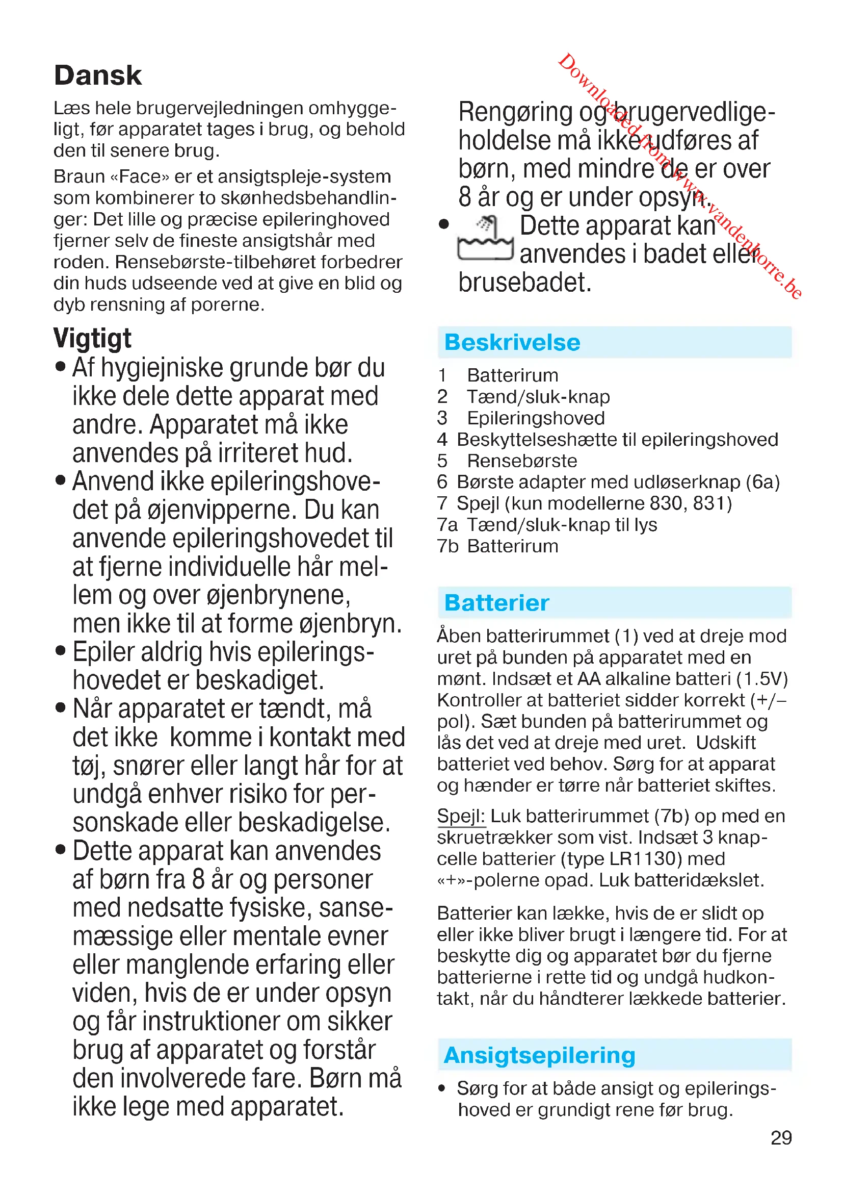Dette apparat kan anvendes i badet eller brusebadet. Beskrivelse 1 Batterirum 2 Tænd/sluk-knap 3 Epileringshoved 4 Beskyttelseshætte til epileringshoved 5 Rensebørste 6 Børste adapter med udløserknap (6a) 7 Spejl (kun modellerne 830, 831) 7a Tænd/sluk-knap til lys 7b Batterirum Batterier Åben batterirummet (1) ved at dreje mod uret på bunden på apparatet med en mønt. Indsæt et AA alkaline batteri (1.5V) Kontroller at batteriet sidder korrekt (+/– pol). Sæt bunden på batterirummet og lås det ved at dreje med uret. Udskift batteriet ved behov. Sørg for at apparat og hænder er tørre når batteriet skiftes. Spejl: Luk batterirummet (7b) op med en skruetrækker som vist. Indsæt 3 knap- celle batterier (type LR1130) med «+»-polerne opad. Luk batteridækslet. Batterier kan lække, hvis de er slidt op eller ikke bliver brugt i længere tid. For at beskytte dig og apparatet bør du fjerne batterierne i rette tid og undgå hudkon- takt, når du håndterer lækkede batterier. Ansigtsepilering