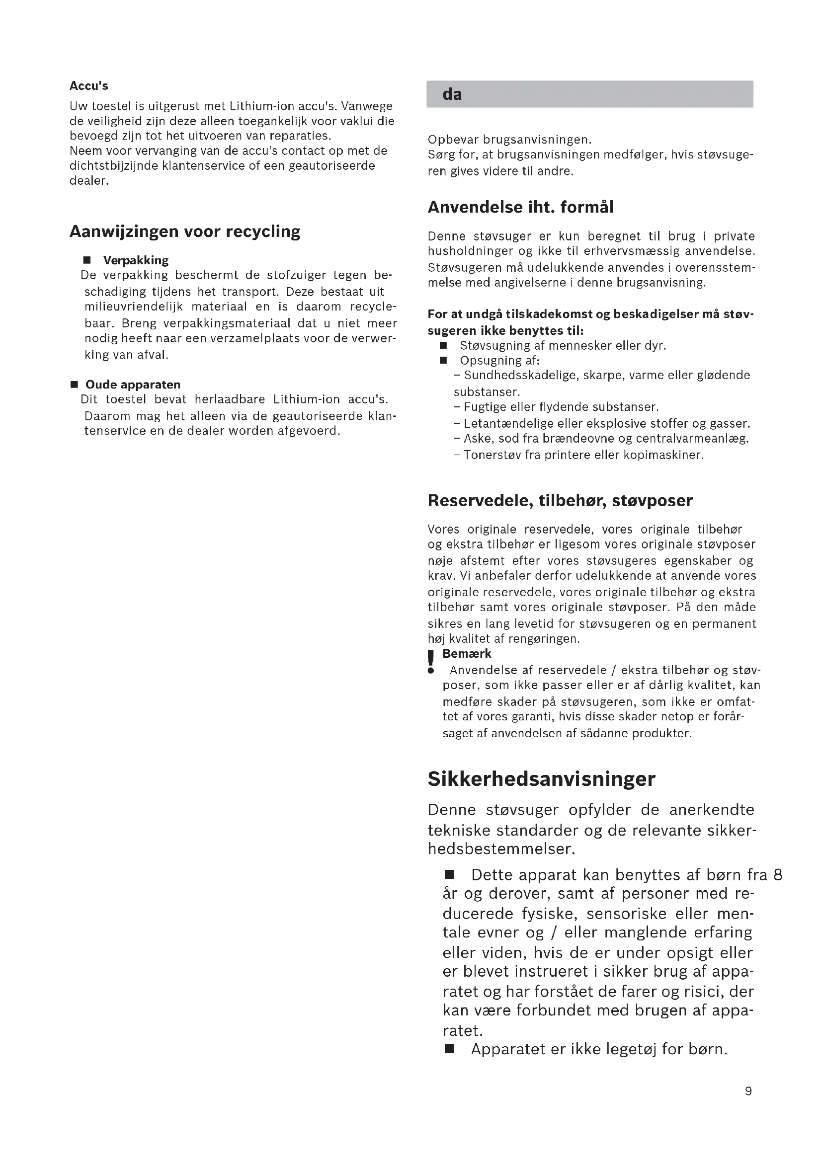 Bemærk Anvendelse af reservedele / ekstra tilbehør og støv- poser, som ikke passer eller er af dårlig kvalitet, kan medføre skader på støvsugeren, som ikke er omfat- tet af vores garanti, hvis disse skader netop er forår- saget af anvendelsen af sådanne produkter. Sikkerhedsanvisninger Denne støvsuger opfylder de anerkendte tekniske standarder og de relevante sikker- hedsbestemmelser. Dette apparat kan benyttes af børn fra 8 år og derover, samt af personer med re- ducerede fysiske, sensoriske eller men- tale evner og / eller manglende erfaring eller viden, hvis de er under opsigt eller er blevet instrueret i sikker brug af appa- ratet og har forstået de farer og risici, der kan være forbundet med brugen af appa- ratet. Apparatet er ikke legetøj for børn. da10 Rengøring og vedligeholdelse må ikke ud- føres af børn, uden at de er under opsigt. Plastikposer og folier skal være uden for børn rækkevidde, når materialet opbeva- res eller kasseres. >= Der er fare for kvælning! Korrekt anvendelse Brug kun det medfølgende ladekabel til at lade op med. Ladekablet må kun tilsluttes og anvendes iht. types- kiltet. Apparatet må kun opbevares og oplades indendørs. Apparatet må ikke udsættes for temperaturer under 0°C og over 40°C. Der må aldrig støvsuges uden filterpose hhv. støvbe- holder, motorbeskyttelses- og udblæsningsfilter. >= Apparatet kan blive beskadiget! Undgå at støvsuge med mundstykke eller rør i nærhe- den af hovedet. => Der er fare for tilskadekomst! Et beskadiget ladekabel må ikke længere bruges og skal udskiftes med et nyt originalt ladekabel. Træk ikke i tilslutningsledningen men i stikket for at tage ladekablet ud af stikkontakten. Undlad at trække ladekablet hen over skarpe kanter, og sørg for, at det ikke kommer i klemme. Sluk altid for apparatet, og træk ladekablet hhv. nets- tikket ud af stikkontakten, inden der foretages arbejde på støvsugeren. Støvsugeren må ikke anvendes, hvis den er beskadi- get. Sluk for apparatet, og træk ladekablet hhv. netstikket ud af stikkontakten, hvis der opstår en fejl. For at undgå fare må reparationer af støvsugeren og udskiftning af reservedele kun udføres af et autorise- ret serviceværksted. Sluk i følgende tilfælde øjeblikkeligt for apparatet, og kontakt kundeservice: − Hvis der ved et uheld er blevet suget væske op, eller hvis der er kommet væske ind i apparatet. − Hvis apparatet er faldet ned og er blevet beskadiget. Støvsugeren skal beskyttes mod fugt, vejr og vind samt påvirkning fra varmekilder. Hæld ikke brændbare eller alkoholholdige substanser på filtrene (filterpose, motorbeskyttelsesfilter, ud- blæsningsfilter etc.) Støvsugeren er ikke beregnet til anvendelse på bygge- pladser. => Opsugning af byggeaffald kan beskadige apparatet. Sluk for apparatet, når der ikke støvsuges. Emballagen beskytter støvsugeren mod beskadigelse under transporten. Derfor anbefaler vi at opbevare emballagen i forbindelse med transport. Batterier Apparatet er forsynet med genopladelige lithium-ion batterier, som af sikkerhedsgrunde kun er tilgængelige for fagfolk. Kontakt et af vores kundeservicecentre eller en auto- riseret forhandler, hvis de genopladelige batterier skal udskiftes. Henvisninger om bortskaffelse Emballage Emballagen beskytter støvsugeren mod beskadigel- se under transporten. Den består af miljøvenlige materialer og kan derfor genbruges. Emballage, der ikke skal anvendes mere, bør bortskaffes på gen- brugsstationer eller lignende. Kasseret apparat Dette apparat indeholder genopladelige lithium-ion batterier. Derfor må dette apparat kun bortskaffes hos vores autoriserede kundeservice eller forhand- leren.11 Ta godt vare på bruksanvisningen. Bruksanvisningen må følge med når støvsugeren skifter eier. Forskriftsmessig bruk Støvsugeren er kun beregnet for bruk i husholdninger og ikke til nærings- og industriformål. Støvsugeren må bare brukes som beskrevet i denne bruksanvisningen. For at det ikke s kal oppstå skader på personer eller gjenstander, må støvsugeren ikke brukes til: støvsuging av mennesker eller dyr oppsuging av: − helseskadelige, skarpe, varme eller glødende stoffer − fuktige eller flytende substanser − lett antennelige eller eksplosive stoffer og gasser − aske, sot fra kakkelovner og sentralvarmeanlegg − tonerstøv fra skrivere eller kopimaskiner Reservedeler, tilbehør, støvposer Våre originale reservedeler, vårt originale tilbehør og spesialtilbehør er likeledes som våre originale støvpo- ser tilpasset egenskapene og kravene til støvsugerne våre. Vi anbefaler derfor at du utelukkende bruker origi- nale reservedeler, originalt tilbehør og spesialtilbehør og våre originale støvposer. Slik kan du forlenge støvsu- gerens levetid og sikre en vedvarende høy rengjørings- effekt.