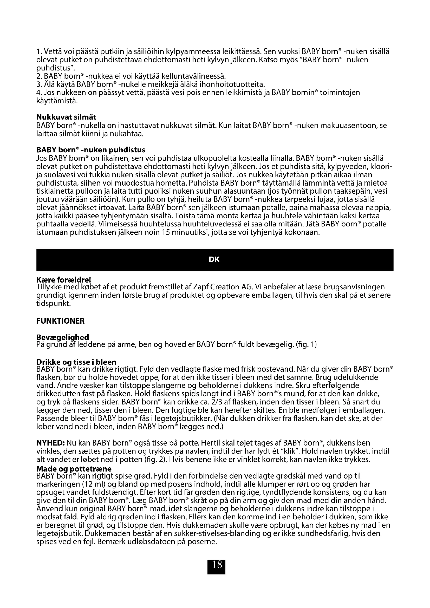 Kære forældre! Tillykke med købet af et produkt fremstillet af Zapf Creation AG. Vi anbefaler at læse brugsanvisningen grundigt igennem inden første brug af produktet og opbevare emballagen, til hvis den skal på et senere tidspunkt. FUNKTIONER Bevægelighed På grund af leddene på arme, ben og hoved er BABY born® fuldt bevægelig. (g. 1) Drikke og tisse i bleen BABY born® kan drikke rigtigt. Fyld den vedlagte aske med frisk postevand. Når du giver din BABY born® asken, bør du holde hovedet oppe, for at den ikke tisser i bleen med det samme. Brug udelukkende vand. Andre væsker kan tilstoppe slangerne og beholderne i dukkens indre. Skru efterfølgende drikkedutten fast på asken. Hold askens spids langt ind i BABY born®’s mund, for at den kan drikke, og tryk på askens sider. BABY born® kan drikke ca. 2/3 af asken, inden den tisser i bleen. Så snart du lægger den ned, tisser den i bleen. Den fugtige ble kan herefter skiftes. En ble medfølger i emballagen. Passende bleer til BABY born® fås i legetøjsbutikker. (Når dukken drikker fra asken, kan det ske, at der løber vand ned i bleen, inden BABY born® lægges ned.) NYHED: Nu kan BABY born® også tisse på potte. Hertil skal tøjet tages af BABY born®, dukkens ben vinkles, den sættes på potten og trykkes på navlen, indtil der har lydt ét “klik”. Hold navlen trykket, indtil alt vandet er løbet ned i potten (g. 2). Hvis benene ikke er vinklet korrekt, kan navlen ikke trykkes. Made og pottetræne BABY born® kan rigtigt spise grød. Fyld i den forbindelse den vedlagte grødskål med vand op til markeringen (12 ml) og bland op med posens indhold, indtil alle klumper er rørt op og grøden har opsuget vandet fuldstændigt. Efter kort tid får grøden den rigtige, tyndtydende konsistens, og du kan give den til din BABY born®. Læg BABY born® skråt op på din arm og giv den mad med din anden hånd. Anvend kun original BABY born®-mad, idet slangerne og beholderne i dukkens indre kan tilstoppe i modsat fald. Fyld aldrig grøden ind i asken. Ellers kan den komme ind i en beholder i dukken, som ikke er beregnet til grød, og tilstoppe den. Hvis dukkemaden skulle være opbrugt, kan der købes ny mad i en legetøjsbutik. Dukkemaden består af en sukker-stivelses-blanding og er ikke sundhedsfarlig, hvis den spises ved en fejl. Bemærk udløbsdatoen på poserne.19 Efter madningen kan BABY born® gå på potte. Hertil skal tøjet tages af BABY born®, dukkens ben vinkles, den sættes på potten og der trykkes på navlen, indtil der har lydt to “klik”. Hold navlen trykket, indtil hele grøden er løbet ned i potten (g. 3). Hvis benene ikke er vinklet korrekt, kan navlen ikke trykkes. Vigtigt! Efter tømningen skal slangesystemet i BABY born®’s indre absolut rengøres med det samme. Læs i den forbindelse “Rengøring af BABY born®”. Gråd Hvis du ere gange trykker på BABY born®’s arm, kan den græde med ægte tårer. (BABY born® skal forinden fodres med vand og må ikke fylde bleen eller gå på potten) At bade BABY born® kan bade i badekarret eller tages med i svømmebadet. Den bør dog ikke dyppes ned under vandet. Undlad at lade din BABY born® ligge i direkte sollys i længere tid uden opsyn (maks. 1 time). Inden badet skal det sikres, at drejelukningen på ryggen af BABY born® er lukket (drejelukningens slids er vandret). Til badet bør der kun anvendes koldt eller lunt vand samt almindelige badeadditiver, som egner sig til børn. Der må ikke leges med BABY born® i bade-, chlor- eller saltvand i mere end 3 timer, idet kemiske reaktioner eller udblegninger ikke kan udelukkes i modsat fald. Rengør din BABY born® med postevand efter badet. Hvis der kommer vand i dukken ved badet, kan BABY born® tørres på følgende vis: Drej drejelukningen på ryggen af BABY born® ved hjælp af en skruetrækker eller en mønt (mod uret) og træk den lidt ud. Lukningen kan ikke ernes fuldstændigt! Vandet kan ernes ved forsigtigt at ryste dukken fra side til side (med ryggen nedad). Gentag ere gange. Om nødvendigt skal dukken luftes i 2-3 timer med åbnet drejelukning for at komme af med restfugten. Luk drejelukningen igen, når dukken er tør. Vigtigt!