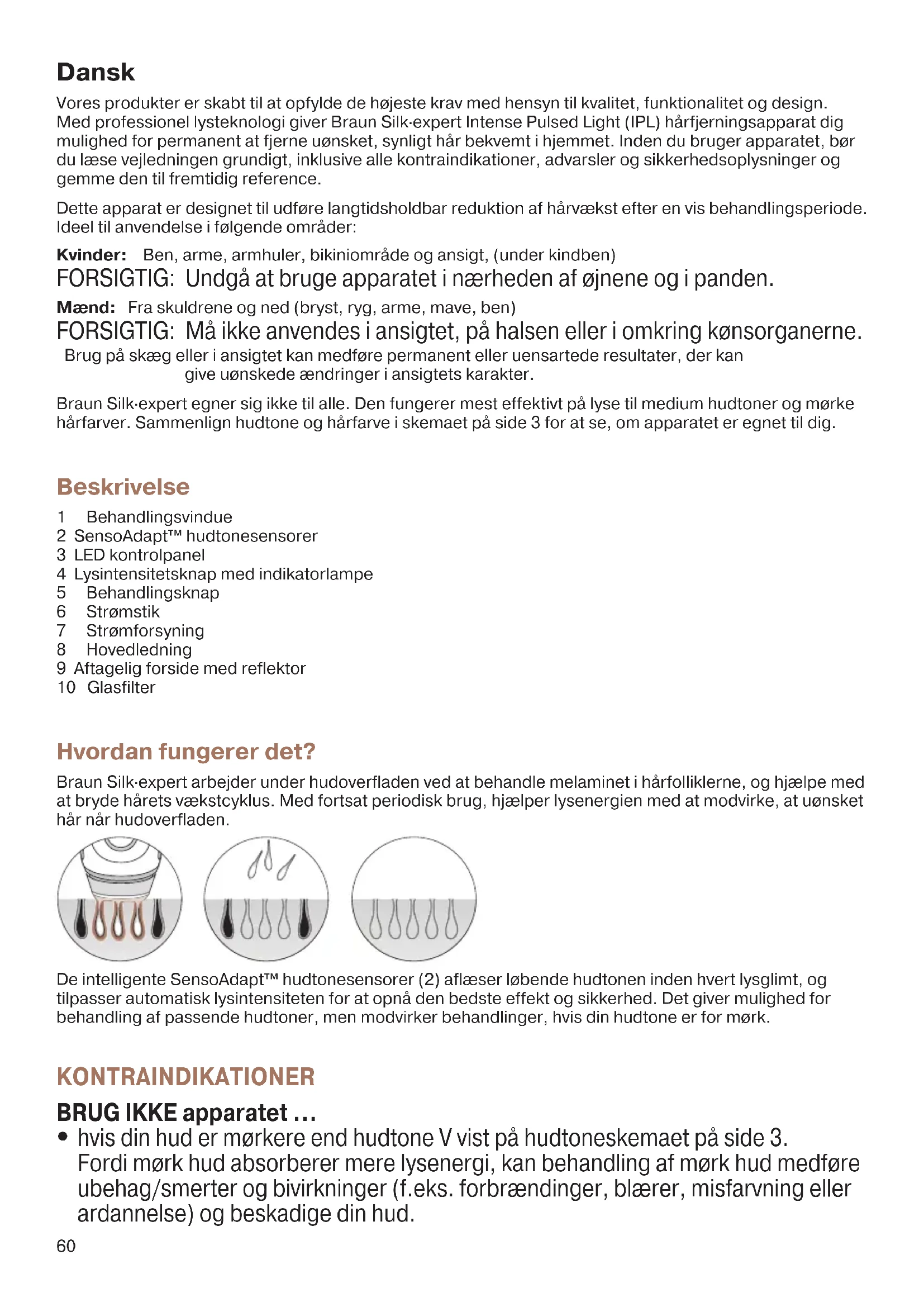 brystvorter, kønsorganer eller omkring anus. Disse områder kan have en mørkere hudtone og/eller tættere hårvækst, og brug af apparatet i disse områder kan medføre ubehag/smerter eller ardannelse på huden.