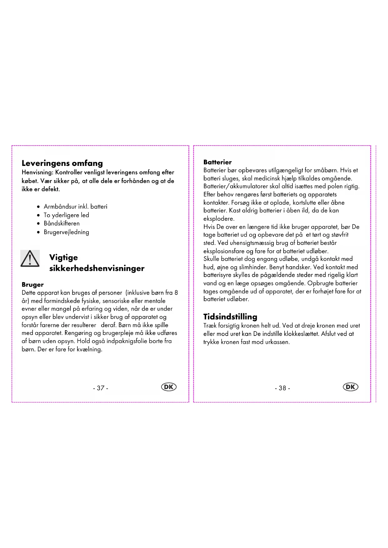 Armbåndsur Indledning Hjertelig til lykke med købet af Deres nye armbåndsur. De har dermed bestemt Dem til et apparat af høj kvalitet. Betjeningsvejledningen er bestanddel af dette armbåndsur. Denne indeholder vigtige henvisninger til sikkerhed, brug og bortskaffelse. Før De tager armbåndsuret i brug, bør De gøre Dem bekendt med alle betjenings- og sikkerhedshenvisninger. Benyt kun armbåndsuret som beskrevet og kun i de angivne indsats områder. Hvis De giver armbåndsuret videre til andre, udlever også alle papirer. Brug i henhold til bestemmelsen Armbåndsuret er egnet til brug som tidsangivelse og til de beskrevne ekstrafunktioner. Enhver anden brug eller forandring af armbåndsuret gælder ikke som brug i henhold til bestemmelsen. Producenten er ikke ansvarlig for skader, der hidrører fra brug uden for bestemmelsesområdet eller fra forkert betjening. Armbåndsuret er ikke beregnet til erhvervsmæssig brug.- 37 - Leveringens omfang Henvisning: Kontroller venligst leveringens omfang efter købet. Vær sikker på, at alle dele er forhånden og at de ikke er defekt.