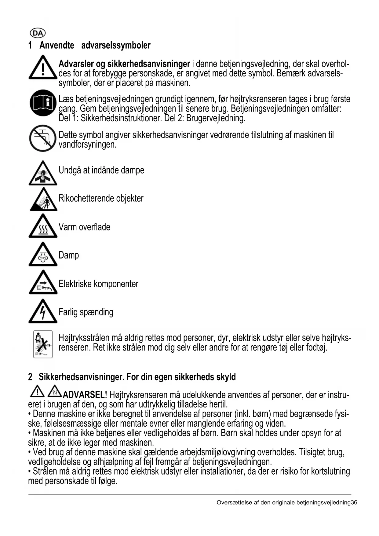 - Om nätkabeln är skadad måste den bytas ut av tillverkaren, deras servicerepresentant eller liknande behörig person för att förebygga fara.Oversættelse af den originale betjeningsvejledning36 1 Anvendte advarselssymboler Advarsler og sikkerhedsanvisninger i denne betjeningsvejledning, der skal overhol- des for at forebygge personskade, er angivet med dette symbol. Bemærk advarsels- symboler, der er placeret på maskinen. Læs betjeningsvejledningen grundigt igennem, før højtryksrenseren tages i brug første gang. Gem betjeningsvejledningen til senere brug. Betjeningsvejledningen omfatter: Del 1: Sikkerhedsinstruktioner. Del 2: Brugervejledning. Dette symbol angiver sikkerhedsanvisninger vedrørende tilslutning af maskinen til vandforsyningen. Undgå at indånde dampe Rikochetterende objekter Varm overflade Damp Elektriske komponenter Farlig spænding Højtryksstrålen må aldrig rettes mod personer, dyr, elektrisk udstyr eller selve højtryks- renseren. Ret ikke strålen mod dig selv eller andre for at rengøre tøj eller fodtøj. 2 Sikkerhedsanvisninger. For din egen sikkerheds skyld ADVARSEL! Højtryksrenseren må udelukkende anvendes af personer, der er instru- eret i brugen af den, og som har udtrykkelig tilladelse hertil.