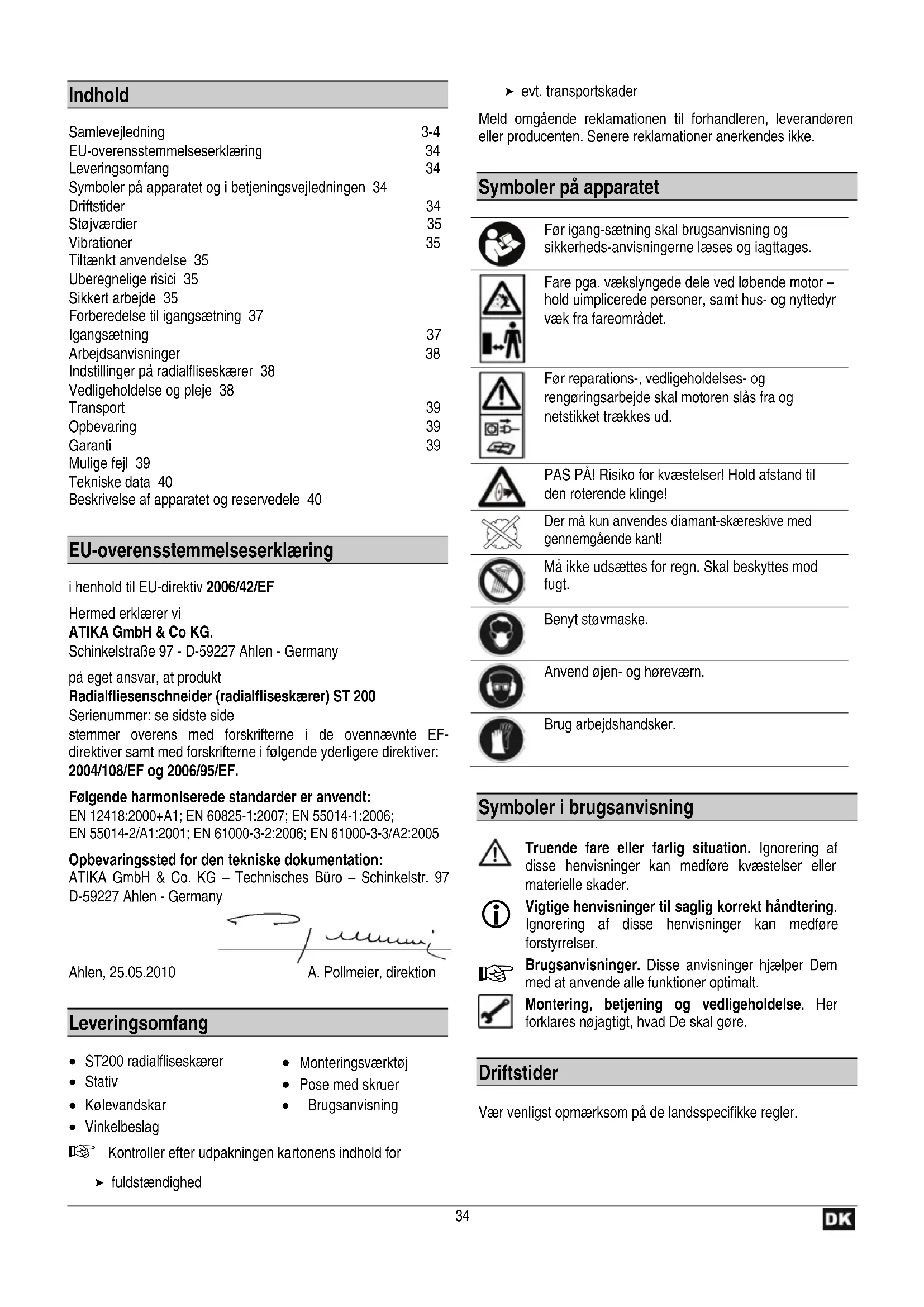 Indhold Samlevejledning 3-4 EU-overensstemmelseserklæring 34 Leveringsomfang 34 Symboler på apparatet og i betjeningsvejledningen 34 Driftstider 34 Støjværdier 35 Vibrationer 35 Tiltænkt anvendelse 35 Uberegnelige risici 35 Sikkert arbejde 35 Forberedelse til igangsætning 37 Igangsætning 37 Arbejdsanvisninger 38 Indstillinger på radialfliseskærer 38 Vedligeholdelse og pleje 38 Transport 39 Opbevaring 39 Garanti 39 Mulige fejl 39 Tekniske data 40 Beskrivelse af apparatet og reservedele 40