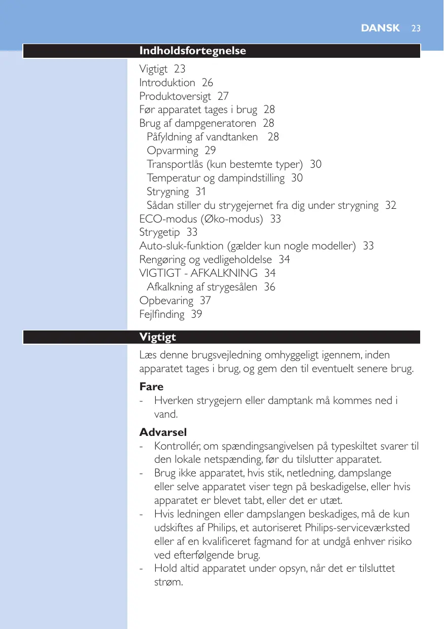 Temps de chauffe 126 Verrouillage du fer (certains modèles uniquement) 127 Température et réglage de la vapeur 128 Repassage 128 Mettre le fer sur son talon pendant le repassage 129 Mode ECO 130 Conseils pour le repassage 130 Mode Arrêt automatique (certains modèles uniquement) 131 Nettoyage et entretien 131 IMPORTANT - DÉTARTRAGE 131 Détartrer la semelle du fer 133 Rangement 135 Dépannage 136 -- N’utilisez pas l’appareil si la fiche, le cordon d’alimentation, le cordon d’arrivée de la vapeur ou l’appareil lui-même est endommagé, s’il est tombé ou s’il fuit. -- Si le cordon d’alimentation ou le cordon d’arrivée de la vapeur est endommagé, il doit être remplacé par Philips, par un Centre Service Agréé Philips ou par une personne qualifiée afin d’éviter tout accident. -- Ne laissez jamais l’appareil sans surveillance pendant qu’il est branché.