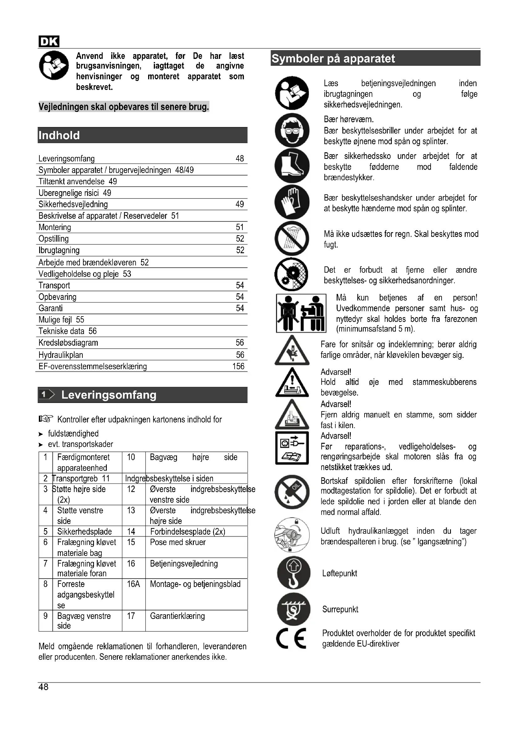 Indhold Leveringsomfang 48 Symboler apparatet / brugervejledningen 48/49 Tiltænkt anvendelse 49 Uberegnelige risici 49 Sikkerhedsvejledning 49 Beskrivelse af apparatet / Reservedeler 51 Montering 51 Opstilling 52 Ibrugtagning 52 Arbejde med brændekløveren 52 Vedligeholdelse og pleje 53 Transport 54 Opbevaring 54 Garanti 54 Mulige fejl 55 Tekniske data 56 Kredsløbsdiagram 56 Hydraulikplan 56 EF-overensstemmelseserklæring 156