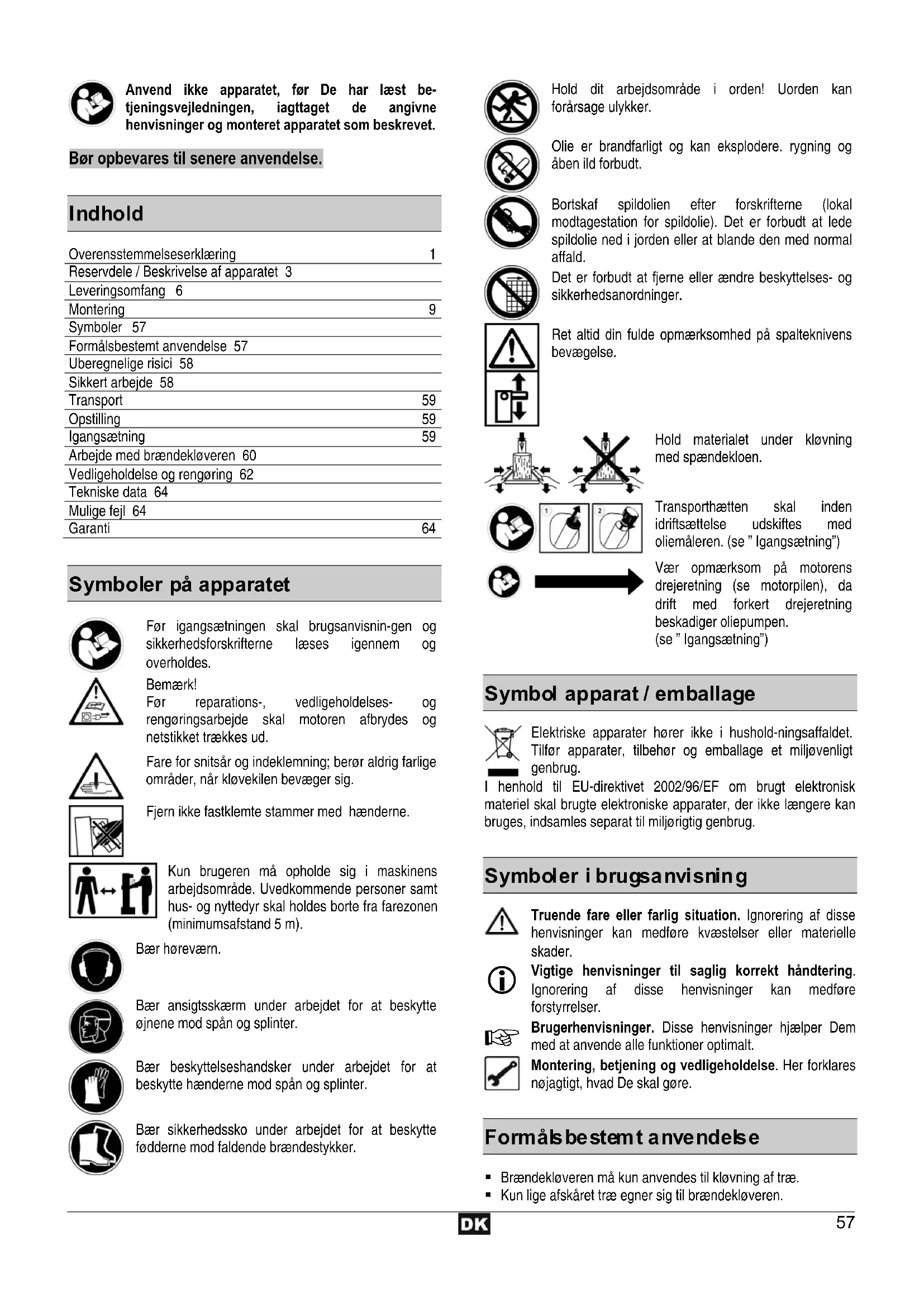 Overensstemmelseserklæring 1 Reservdele / Beskrivelse af apparatet 3 Leveringsomfang 6 Montering 9 Symboler 57 Formålsbestemt anvendelse 57 Uberegnelige risici 58 Sikkert arbejde 58 Transport 59 Opstilling 59 Igangsætning 59 Arbejde med brændekløveren 60 Vedligeholdelse og rengøring 62 Tekniske data 64 Mulige fejl 64 Garanti 64